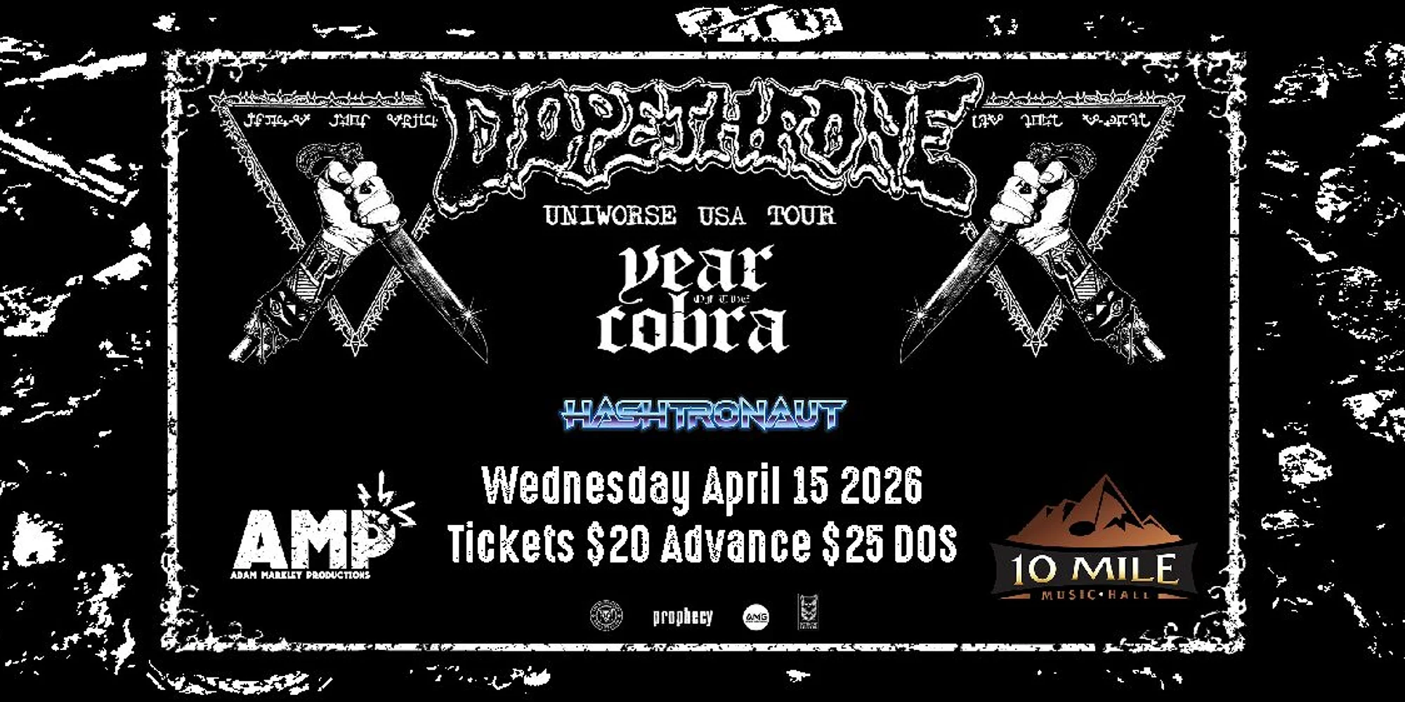 Just Announced!!! Dopethrone w/ Year Of The Dragon & Hashtronaut, April, 15, 2026!!! Tickets $20 Advance and $25 DOS Tickets on sale now: https://amp.ticketsauce.com/e/dopethrone-w-year-of-the-cobra Dopethrone: Dopethrone is a three piece band from Montreal, Quebec, Canada. Active since 2008, this DIY band is known for their abrasive mix of sludge and doom with lyrics based in the self destruction, cannabis, sleazy drug abuse, and the macabre. Influenced by rock n roll, punk, black metal, and blues, the band refers to their music as “Slutch”, the Canadian term for cold sludge, a.k.a. dirty mud snow. They once described it as “frozen sludge, snow covered in addiction, blood, tears, and broken dreams”. After their second release, the band started drawing some attention to them and were invited by Voivod to perform at Roadburn 2012. They since haven’t stopped growing their audience in Europe, their adoptive land. Since their formation, Dopethrone has release five full length studio albums to date, joined some collaborations with other artists, and have regularly toured Europe and Canada. After a series of massive tours in 2019, the band has not hit the road since, and focused on the ‘delicate’ baking of their new release. The new effort, to be out early 2024, will come with North American tours, and even a return to Europe for select dates.