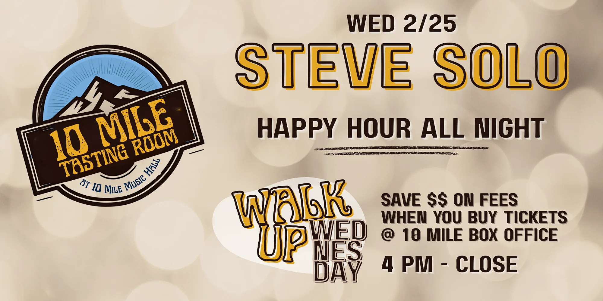 10 Mile Music Hall Presents Steve Solo Join us for live music, house games, and Happy Hour all evening! Every Wednesday – Music @ 7pm WALK UP WEDNESDAYS Save $$ on ticket fees when you buy tickets at the 10 Mile Box Office. $2 fees for any AXS-ticketed event, while supplies last Every Wednesday 4pm to close.