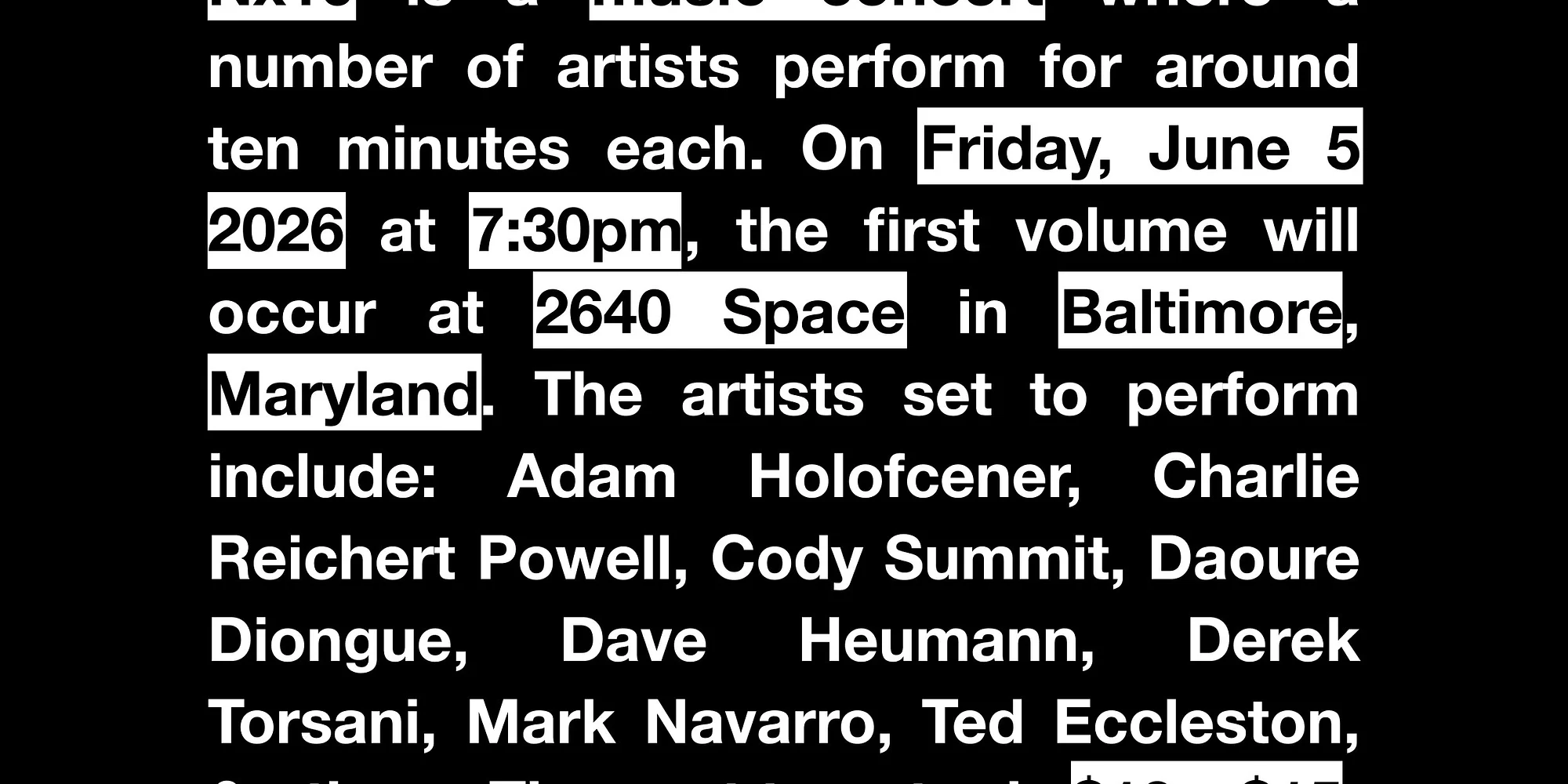 $10-15 at the door. Nx10 is a music concert where a number of artists perform for around ten minutes each. Featuring: Adam Holofcener Charlie Reichert Powell Cody Fummit Daoure Diongue Dave Heumann Derek Torsani Mark Navarro Ted Eccleston & others