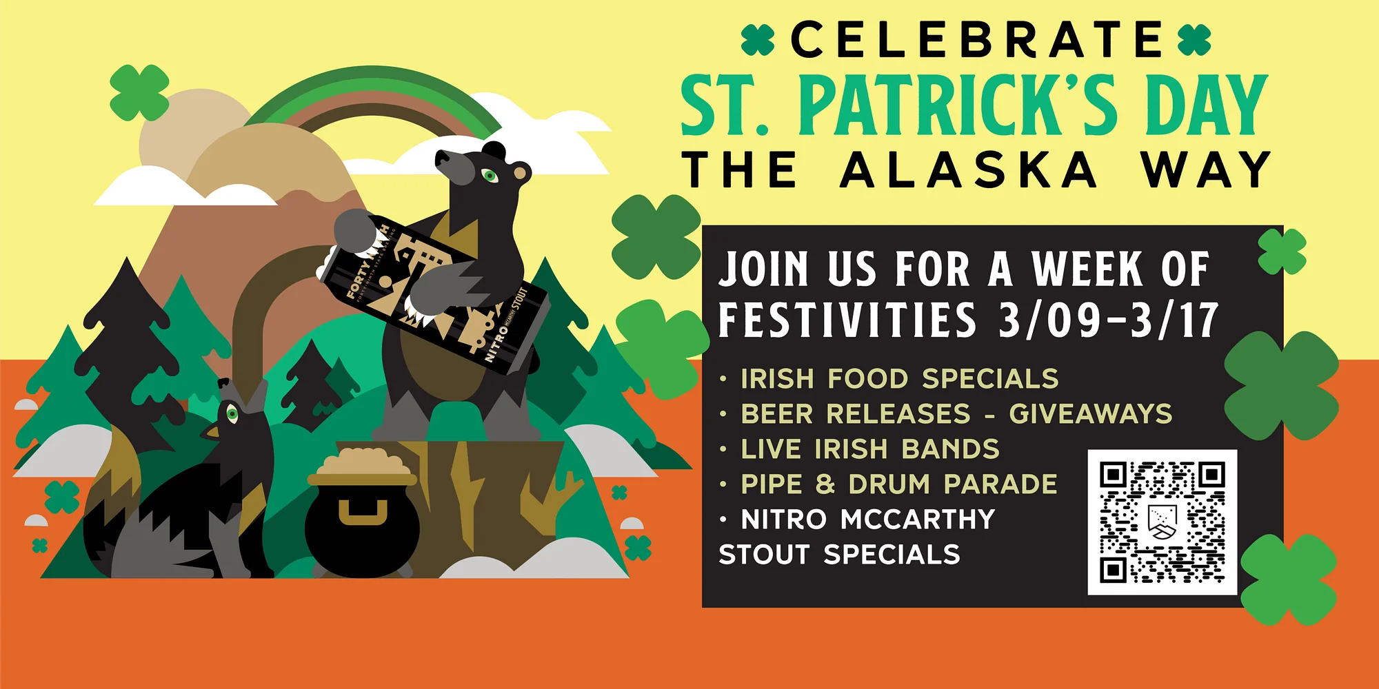 49th State Brewing hosts Alaska’s largest St. Patrick’s Day celebration across multiple March dates. Guests can enjoy Irish/Celtic live music, traditional Irish food specials, NITRO McCarthy Stout on tap and in cans, a pot o’ gold giveaway for guests wearing green, and appearances by Alaska Celtic Pipes & Drums (times TBD). Andrea Childers (fiddle) live Mar 13 & 15: 6–9 p.m. Bosca Ceoil (Lisa Maloney) live Mar 14 & 17: 6–9 p.m. St. Patrick’s Menu runs Mar 9-17. – MENU COMING SOON When St. Patrick’s Day rolls around, there’s one beer style that reigns supreme: a proper Irish stout. And here in Alaska, we don’t just do tradition, we do it our way. Enter Nitro McCarthy Stout, Alaska’s original nitro stout and the most-awarded stout in the state. Smooth, creamy, and packed with character, this is the beer to raise when you’re celebrating all things Irish with a distinctly Alaskan edge. Besides the beautiful bubble on draft, you’ll be able to stock up on the nitro cans all over the state. BONUS: In our pubs you’ll save $2 when you purchase two 4-packs!* *Valid March 9-17. Restrictions Apply
