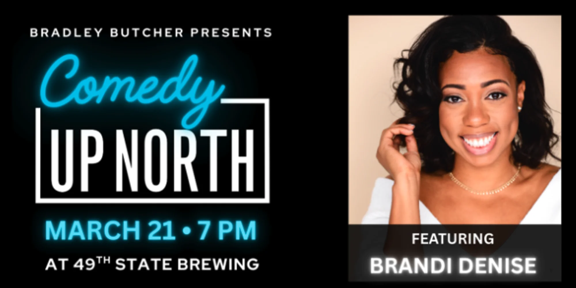 Comedy Up North presents Brandi Denise March 21 • 7 PM • 49th State Brewing, Anchorage 21+ Event | All Sales Final Join us for a night of great stand-up comedy in Anchorage! Brandi Denise is a standup comedian, actor, and writer, who can be seen as a series regular on the BET show GAMES PEOPLE PLAY, and can be seen recurring on Starz’ POWER and POWER BOOK II: GHOST. She most recently appeared on ABBOT ELEMENTARY. Brandi’s standup comedy is often described as honest, witty and refreshing with huge bursts of energy. You can catch her stand-up on Comedy Central or while she’s touring across the country. Don’t miss Brandi Denise live in Anchorage for a standout night of comedy. Get Tickets