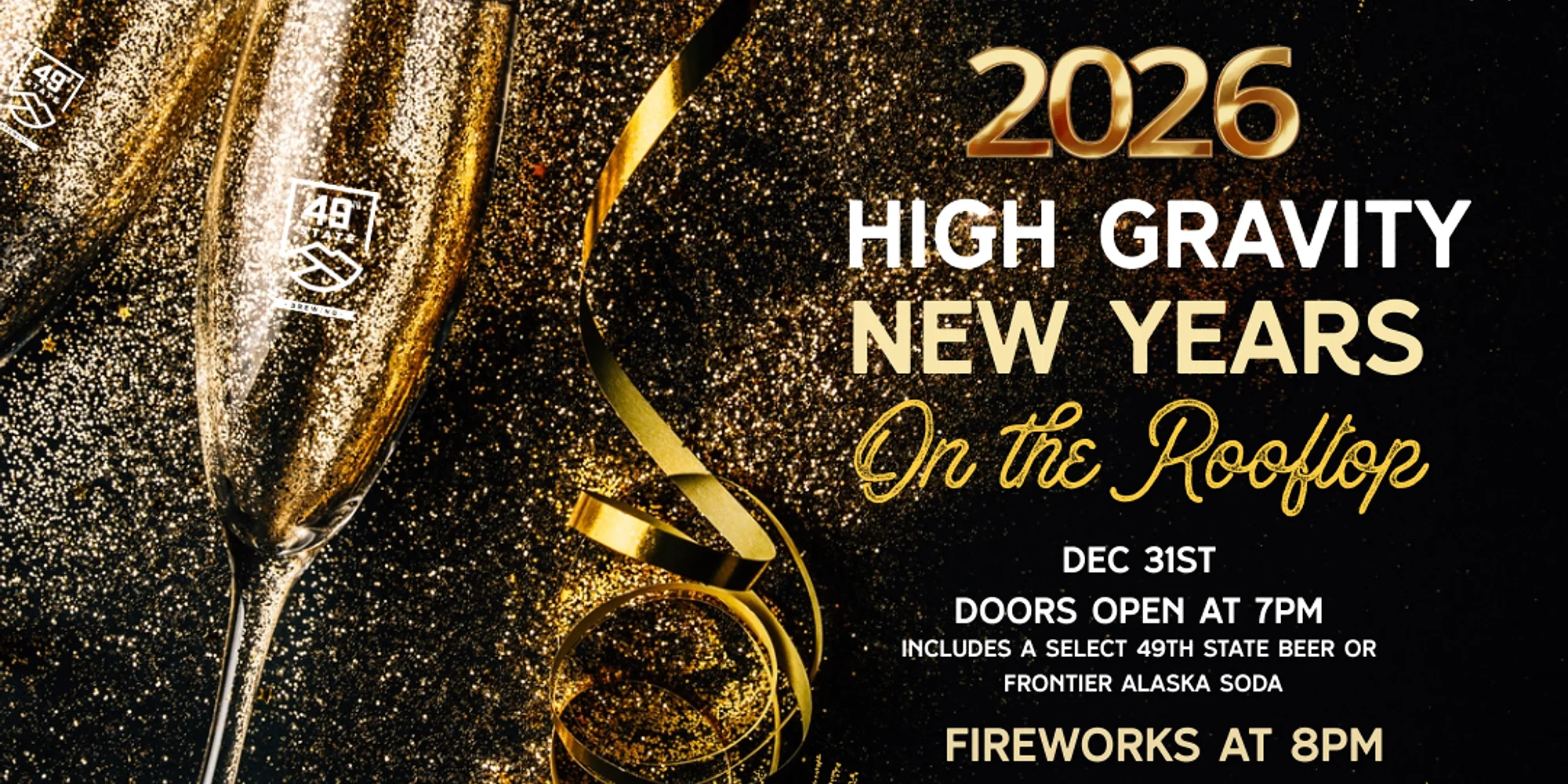 Ring in the new year watching the fireworks display from the 49th State Brewing rooftops. Our rooftop patios are the best places in town to enjoy the fireworks. Fireworks start at 8:00pm. The doors to the rooftops will open at 7pm. We recommend arriving an hour before the fireworks to get checked in and have a drink in hand. We’ll have heaters out on the patio and plenty of winter warmer cocktails. There are very limited seats and plenty of standing room for cocktailing and admiring the show. All spots on the rooftops are first-come, first-served. The Heritage Theater is open so you can hang out with your friends and family in warmth before and after the big event. Browse the high gravity Cache Collection beer releases at the booth and shop our rarest and most unique collection. Reservation Fees per person: $20 Your ticket includes your choice of select Frontier Soda or flagship 49th State Brewing beer. Space is limited on the rooftops, so get your tickets today here: https://www.eventbrite.com/…/new-years-fireworks-at… If you’re joining for dinner, tickets are not required, but reservations are going quickly! Make yours online today. Rooftop Party Ticket Fees are non-refundable.
