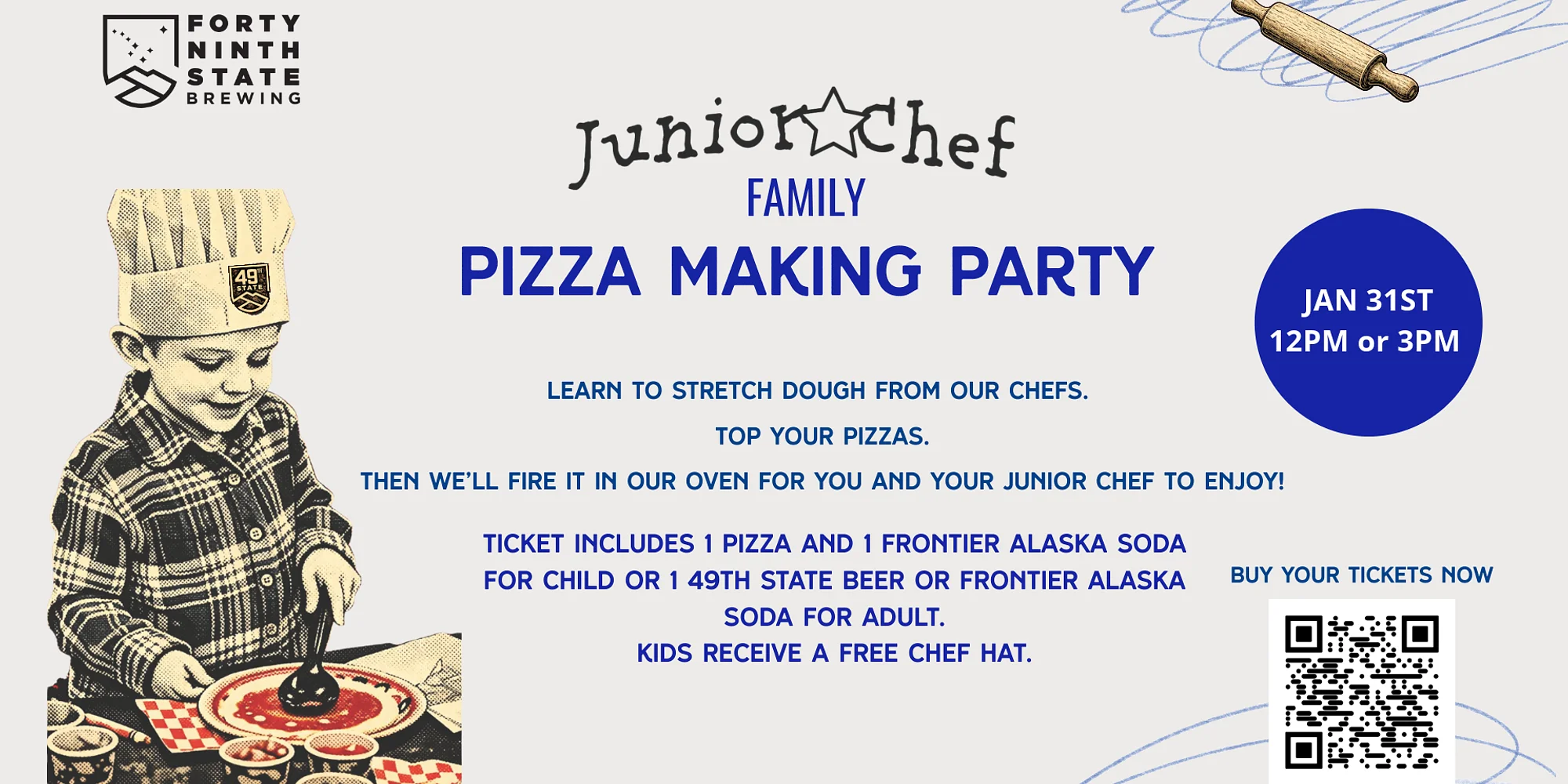 Join us at 49th State Brewing for this fan favorite series of family friendly pizza making parties. Learn the art of making pizza from 49th State chefs, then let us fire your creation for you in our wood stone pizza oven! Each ticket is $24 per person (adults and their kids will each need their own tickets). There are 2 sessions. One at 12pm and one at 3pm. Kids Receive: 1 chef hat 1 personal pizza 1 Frontier Alaska Soda Adults Receive: 1 personal pizza 1 49th State Beer* or Frontier Alaska Soda * Must present valid ID. Not valid for to-go beer. Tickets are non-refundable. Get Tickets