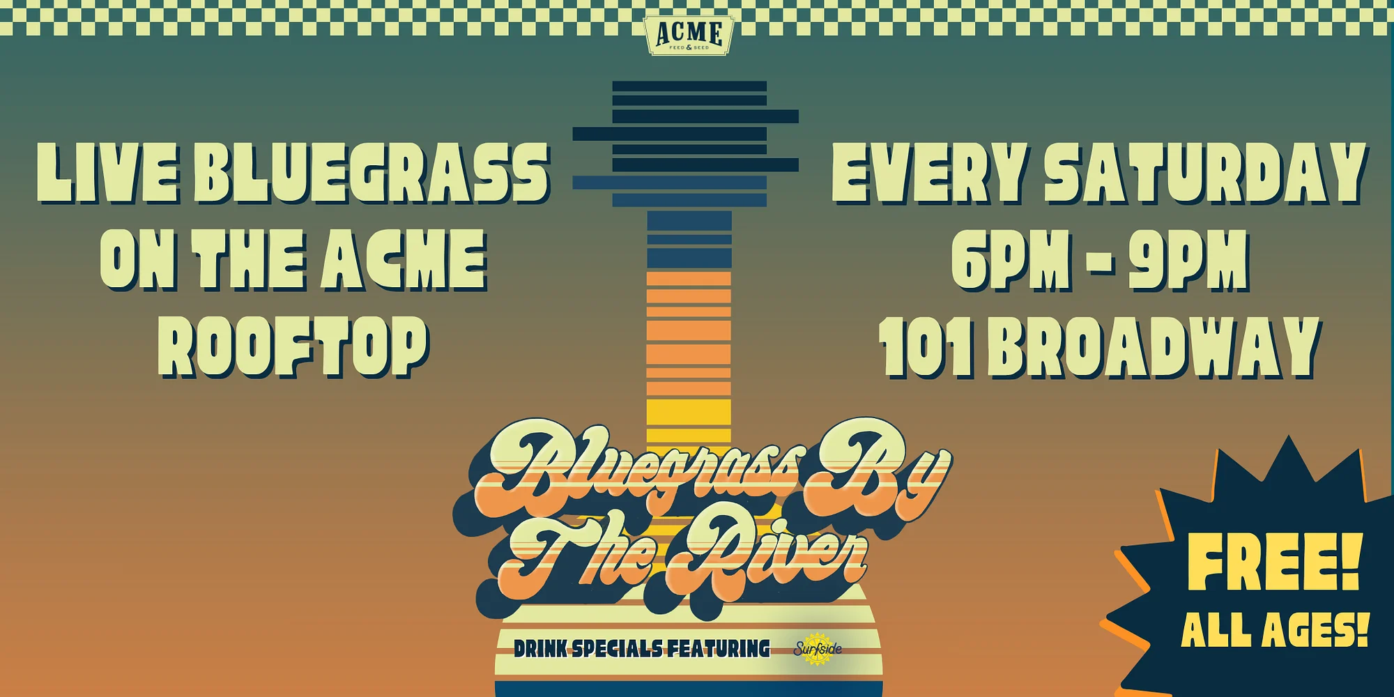 Join us for some amazing bluegrass music every week starting on Saturday, April 18th! Kick back, enjoy the fresh air, and soak up the vibes on the rooftop. Bring your friends, grab some food, and enjoy $1 off Surfside all night long. rooftop / all ages / free