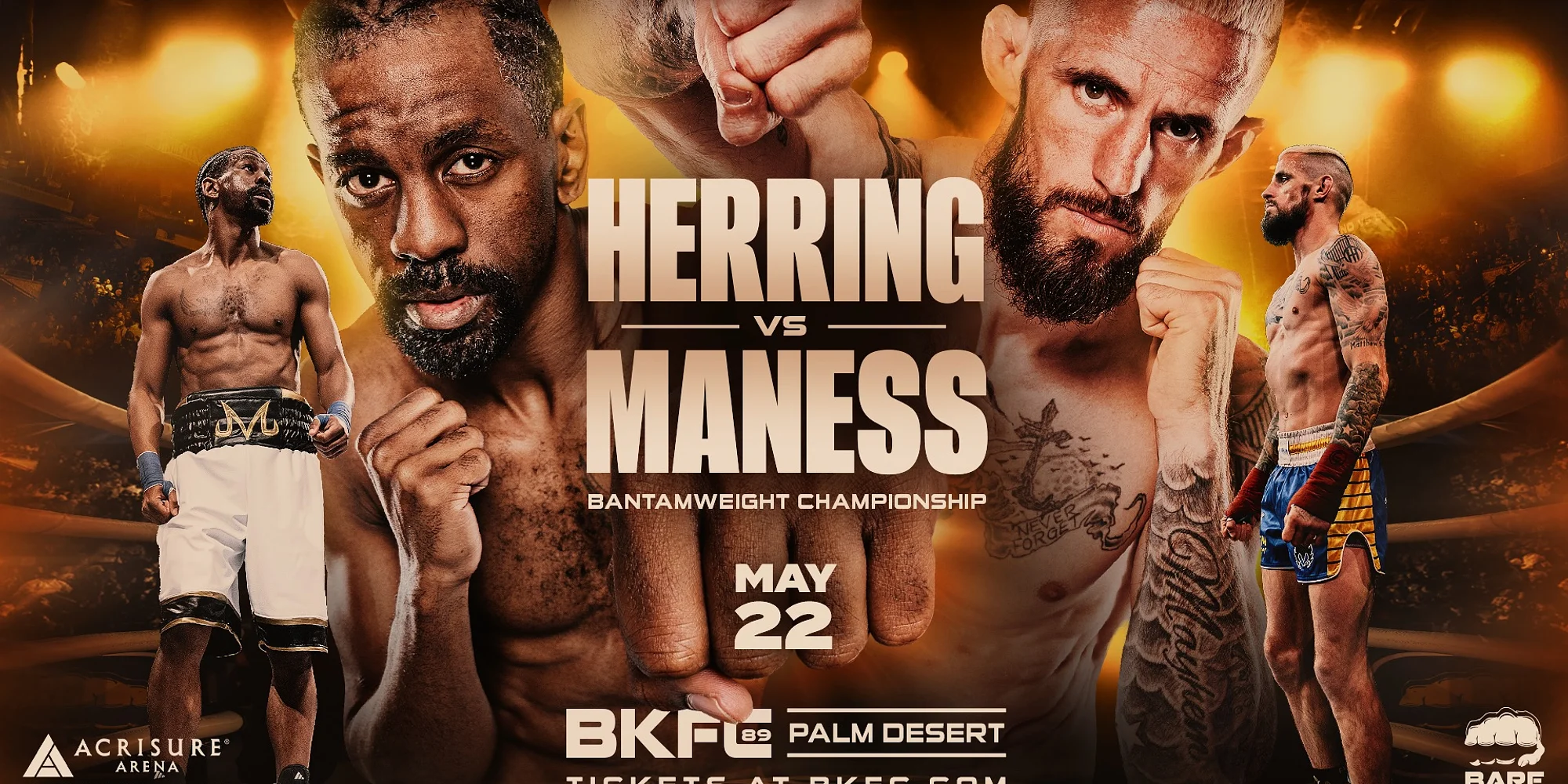 THE WORLD’S FASTEST GROWING COMBAT SPORTS PROMOTION IS COMING BACK TO THE COACHELLA VALLEY! Tickets On-Sale This Monday at 10am PT on Ticketmaster The World’s Fastest Growing Combat Sports Promotion, makes their highly anticipated return to Acrisure Arena in Palm Desert, CA on Friday, May 22, 2026. Tickets for BKFC Fight Night Palm Desert will go On-Sale this Monday, March 9 at 10:00 a.m. PDT and can be purchased at BKFC.com and the Ticketmaster Box Office at Acrisure Arena. The Acrisure Arena is located at 75702 Varner Rd., Palm Desert, CA 92211. Purchase parking in advance HERE. More venue information can be found at AcrisureArena.com. Additionally, Acrisure Arena invites fans to enhance their BKFC experience by upgrading to the Compound, an exclusive outdoor VIP premium space just steps from the stage. The Compound offers a hosted full-service bar (spirits for purchase), a generous buffet, and unique amenities such as cozy fire pits, mini golf, bocce ball, and more. Learn more HERE! “BKFC is excited to announce our sixth event in Southern California and our second at the beautiful Acrisure Arena on May 22.” said David Feldman, Founder and President of BKFC. “Our first event in Palm Desert, CA on November 15th was a tremendous success and we’re putting together another outstanding card featuring some of the best bare-knuckle fighters in the world along with the top talent in Southern California.” “Tickets go on-sale this Monday, March 9 and we’ll be announcing the fights shortly. As tickets sold quickly for our last event, I strongly encourage fans to purchase well in advance.” EVENT LAYOUT