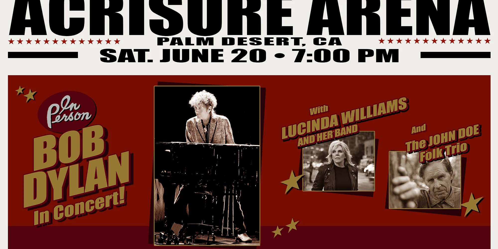 Bob Dylan will perform at Acrisure Arena in Palm Desert, CA on Saturday, June 20, 2026, with Lucinda Williams and The John Doe Folk Trio. Bob Dylan’s career has lasted the better part of SIXTY years now. He has never gotten by on sentimentality or nostalgia. He has never repeated his successes. Dylan has always pushed his work ahead. TICKETS: Presale begins this Thursday, March 26 and goes from 10 am – 10 pm PT. Tickets go on sale to the general public on Friday, March 27 at 10 a.m. local time and can be purchased at Ticketmaster.