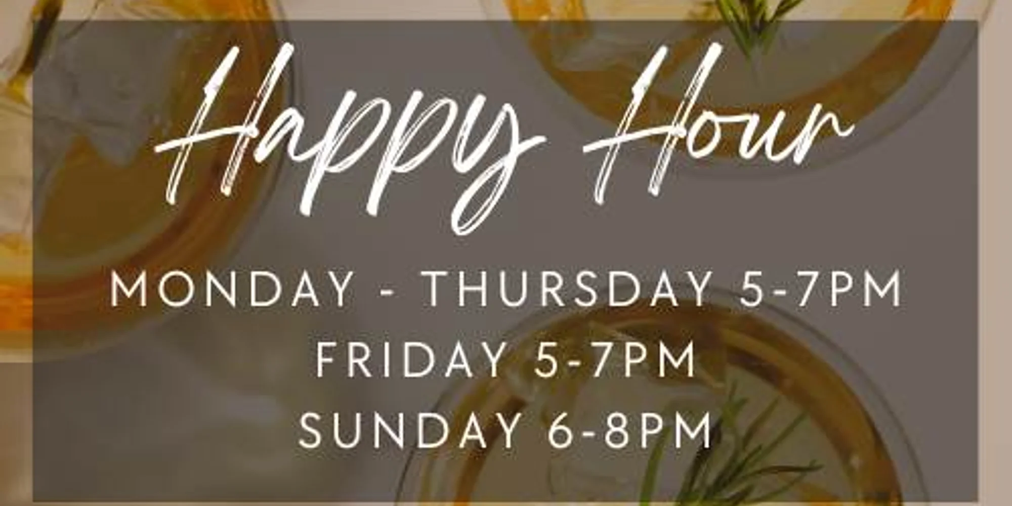 Monday – Thursday 5pm-7pm , Friday 4pm-7pm, Sunday 6pm – 8pm Happy Hour Menu