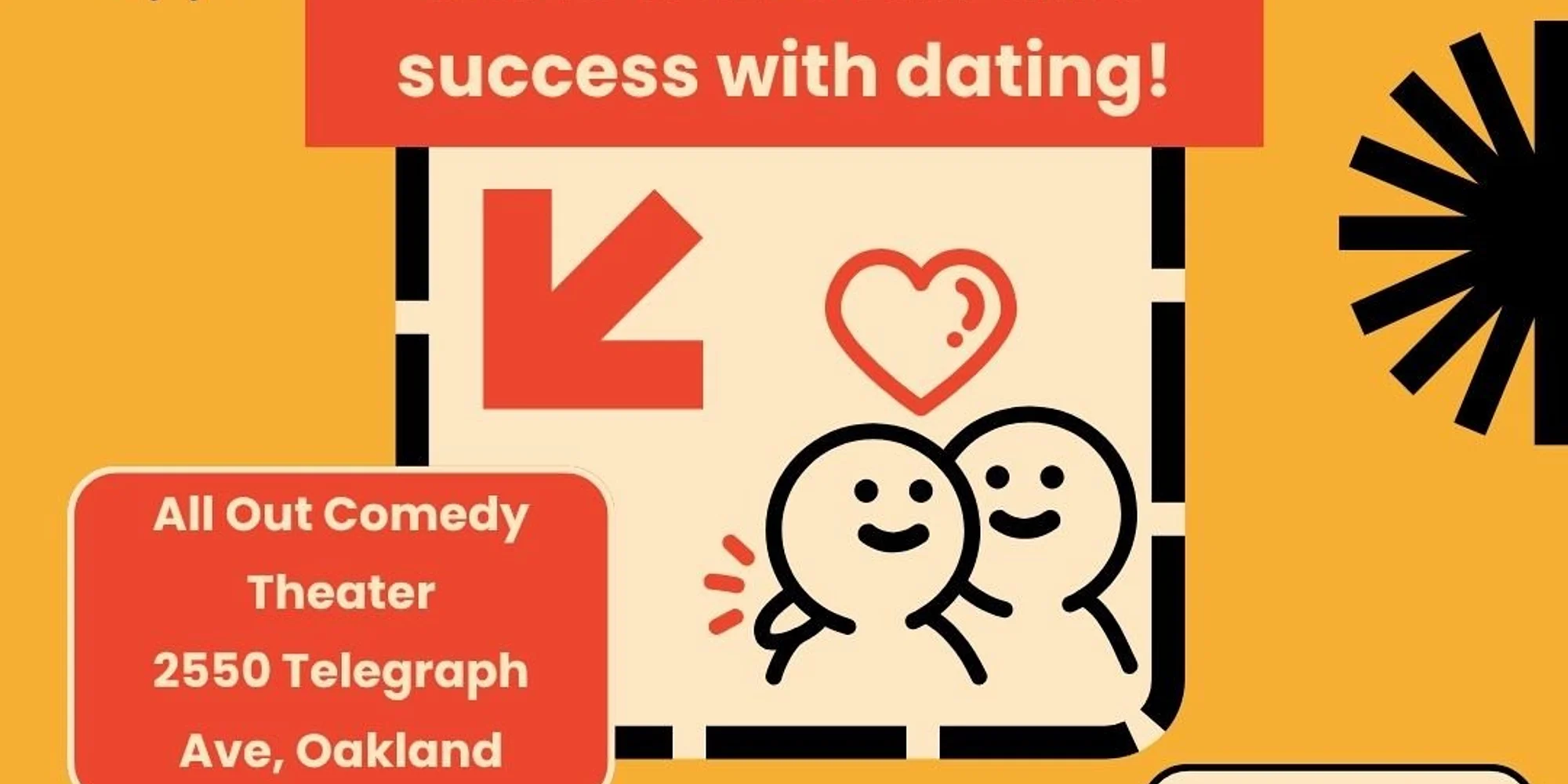 Register IMPROV(E) YOUR DATING LIFE Explore your dating tendencies, expand your dating pool, and live in the moment in this improv-based dating course. No improv experience needed. All are supported in an inclusive space. Requirements: 18 Years + Teacher: Dylan Garcia Optional Dates: December 7, Sunday, 3:30pm-5:30pm Or December 17, Wednesday, 7:00pm-9:00pm Registration: $35 Location: All Out Comedy Theater, 2550 Telegraph Avenue, Oakland, CA 94612: *Check your maps says Oakland. There's a duplicate address in Berkeley.