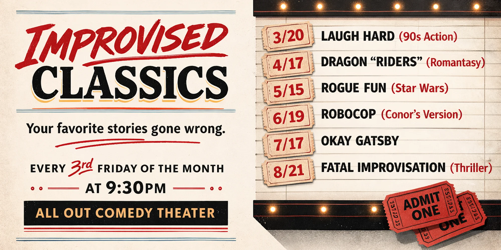 tickets Improvised Classics Comedy Show You know the stories. You love the characters. Now watch them go completely off the rails. Improvised Classics is a monthly live comedy show where top Bay Area comedians take a beloved franchise and spin it into a hilarious, unexpected narrative — fueled entirely by suggestions from the audience. A different franchise every month. A brand new story every time. Always a blast. Dates: Third Fridays of the Month, 9:30pm-10:30pm Tickets: $12 Online/$15 At The Door Restrictions: None, we are an all ages theater. Content is PG13. Location: All Out Comedy Theater, 2550 Telegraph Avenue, Oakland, CA 94612 *Please check your maps says Oakland. There's a duplicate address in Berkeley