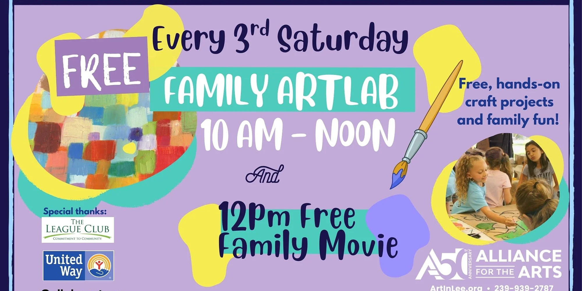Family Fun Day at the Alliance! Make creativity part of your family routine the 3rd Saturday of each month during Family ArtLab! Drop in for free, hands-on family fun from 10 a.m. to noon. Explore something new every month like art making, gallery activities, games and more – all inspired by artworks on view in the gallery, famous artists, national holidays and artistic traditions around the world. All ages and abilities are encouraged to participate.