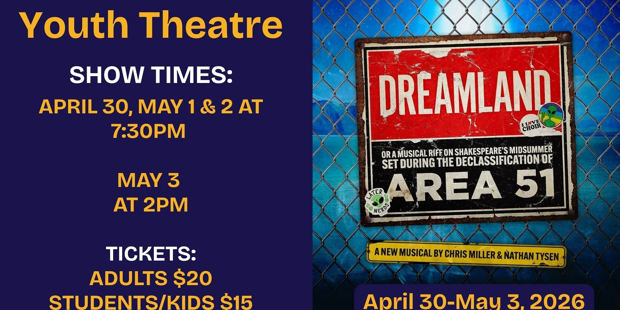 About the Show: Dreamland (or a musical riff on Shakespeare’s Midsummer set during the declassification of Area 51) is exactly what the title says it is, or is it? Who thought it would be a good idea to give a group of high school honor students free rein in a top-secret military base two days before it opens to the public? Will there be aliens? Maybe. A show choir? Definitely. An over-the-top, B-movie-style musical comedy with a score that blends contemporary musical theatre pop with the smooth sounds of the 1950s, Dreamland is the brainchild of Chris Miller & Nathan Tysen, award-winning songwriters of Tuck Everlasting on Broadway. Show Times: April 30, May 1 & 2 @ 7:30pm, May 3 @ 2pm Tickets: Students/Kids $15, Adults $20