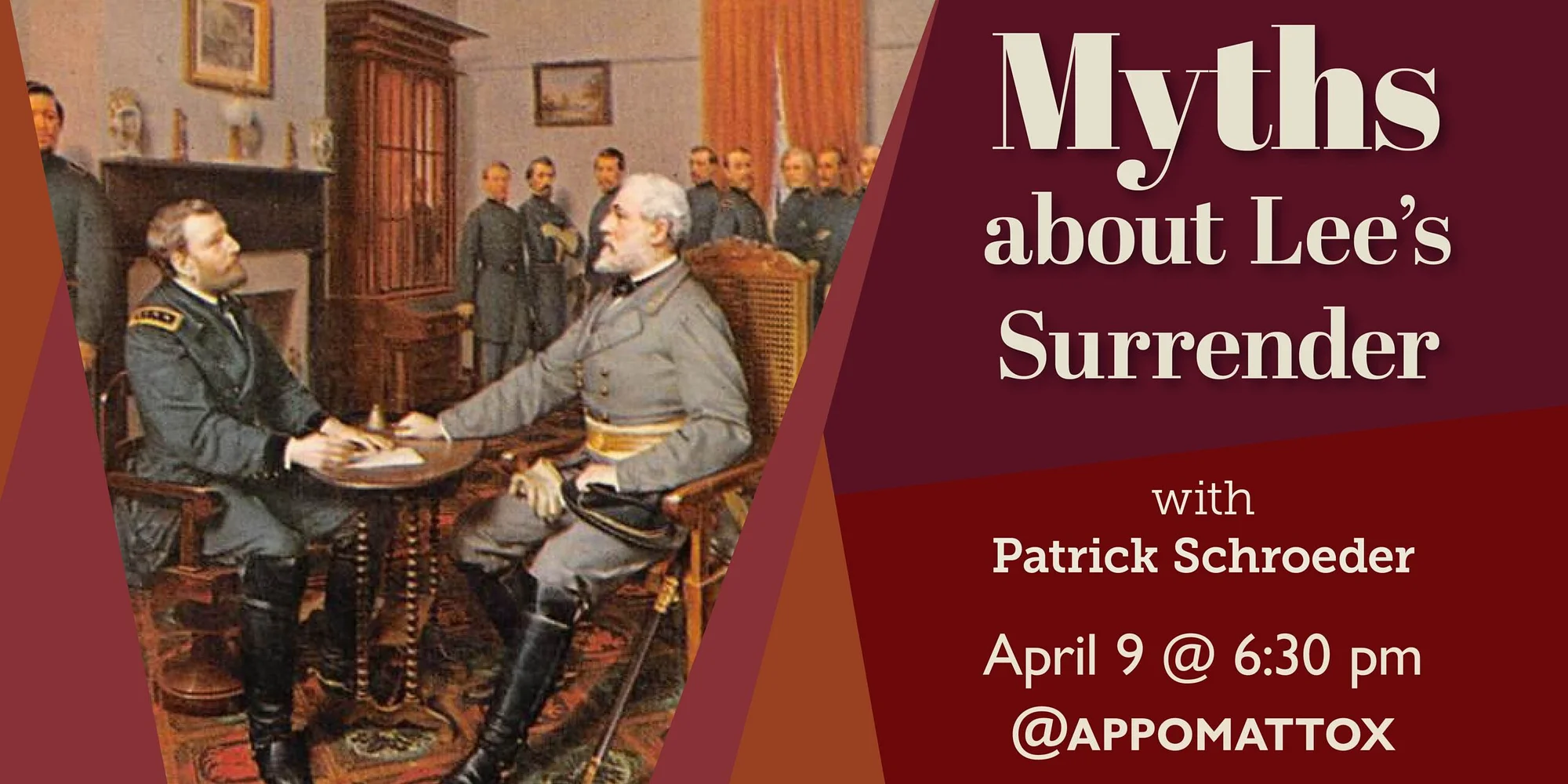 @ In commemoration of the surrender at Appomattox, join us as Patrick Schroeder, Historian at Appomattox Court House National Historic Park, delves deeper into what really happened on April 9, 1865. Drawing on research for his books Thirty Myths about Lee’s Surrender and More Myths about Lee’s Surrender, Patrick Schroeder separates myth from fact. / Free to Members Add to calendar Google Calendar iCalendar Outlook 365 Outlook Live