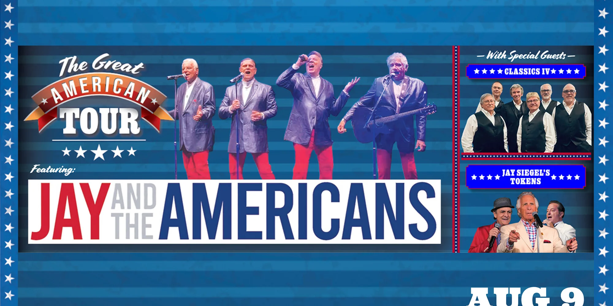 Tickets: $39 $59 $69 $79 AMT Member Pre-Sale: Wednesday, February 11 at 10:00 a.m. Public On-Sale: Friday, February 13 at 10:00 a.m. The Great American Tour is a celebration of the timeless music that defined a generation—and continues to resonate today. Baby Boomers have never lost their passion for the “oldies but goodies” of the 1960s and 70s, and this unforgettable show delivers the songs that shaped youth, freedom, and the unifying power of rock ’n roll. Featuring iconic artists inducted into the Vocal Group Hall of Fame, this tour brings together legendary performers whose hits remain woven into modern movies, television, and commercials, captivating audiences across generations. Headlining the tour are Jay and the Americans, one of the era’s few groups still featuring two original members. With an incredible legacy that includes 19 charted hits and 9 Top 40 records, the group continues to thrive with over 900,000 monthly Spotify listeners. Their smash hit “Come a Little Bit Closer”—famously featured in Guardians of the Galaxy—has amassed more than 190 million streams, while classics like “This Magic Moment,” “Cara Mia,” “Walkin’ in the Rain,” and “Only in America” remain beloved fan favorites. Joining them are The Classics IV, renowned for their instantly recognizable sound and million-selling, Gold Disc–winning hits “Spooky,” “Traces,” and “Stormy.” Also appearing are Vocal Group Hall of Fame inductees Jay Siegel’s Tokens, led by original frontman Jay Siegel, still thrilling audiences with soaring falsettos on classics such as “Tonight I Fell In Love,” “I Hear Trumpets Blow,” and the immortal “The Lion Sleeps Tonight,” a song continually rediscovered through The Lion King on Broadway and film. Perfect for audiences eager to relive cherished memories—or introduce younger generations to the music that started it all—The Great American Tour delivers enduring hits with heart, harmony, and history. For certain concerts, audience members may prefer to stand or dance, especially when encouraged by the artist to do so. Guest expectations differ, so we simply ask all attendees to extend mutual respect toward one another and maintain awareness of those around them. Our staff will only intervene in matters of safety or when behavior is deemed unruly, combative, or disruptive to the overall performance.