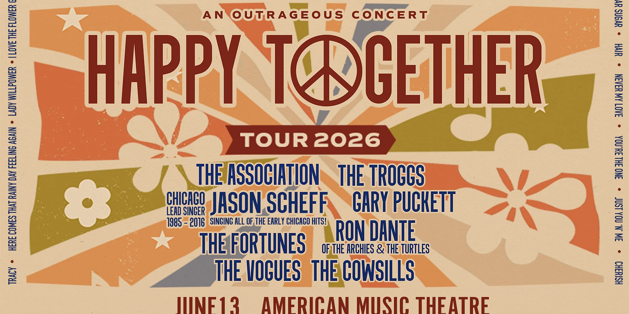 Tickets: $69 $79 $89 AMT Member Pre-Sale: Wednesday, January 7 at 10:00 a.m. Public On-Sale: Friday, January 9 at 10:00 a.m. (VIP1) HAPPY TOGETHER: $191 Includes: One Premium Reserved In Rows 2-5 One, VIP Only, Tour Poster Autographed By Graphic Artist / Designer* Limited Availability *Poster shipped directly to purchasers after the show has concluded *tour poster is limited, numbered & signed by the graphic artist that designed the poster** **poster autographed by graphic artist, NOT band members performing at the show. (VIP2) HAPPY TOGETHER: $180 Includes: One Premium Reserved In Rows 5-15 One, VIP Only, Tour Poster Autographed By Graphic Artist / Designer* Limited Availability 2026 will mark the 17th year of the highly successful, hit-filled summer package, THE “HAPPY TOGETHER” TOUR. The touring sensation that has crisscrossed the nation delighting audiences for over a decade and a half returns this summer with a show full of chart-topping hits from the ‘60s and ‘70s – an undeniable 60+ BILLBOARD Top 40 smashes. The Tour is once again joined by THE ASSOCIATION, THE TROGGS, CHICAGO lead singer 1985-2016 JASON SCHEFF, GARY PUCKETT, THE FORTUNES, RON DANTE from The Archies and The Turtles, THE VOGUES and THE COWSILLS. For certain concerts, audience members may prefer to stand or dance, especially when encouraged by the artist to do so. Guest expectations differ, so we simply ask all attendees to extend mutual respect toward one another and maintain awareness of those around them. Our staff will only intervene in matters of safety or when behavior is deemed unruly, combative, or disruptive to the overall performance.