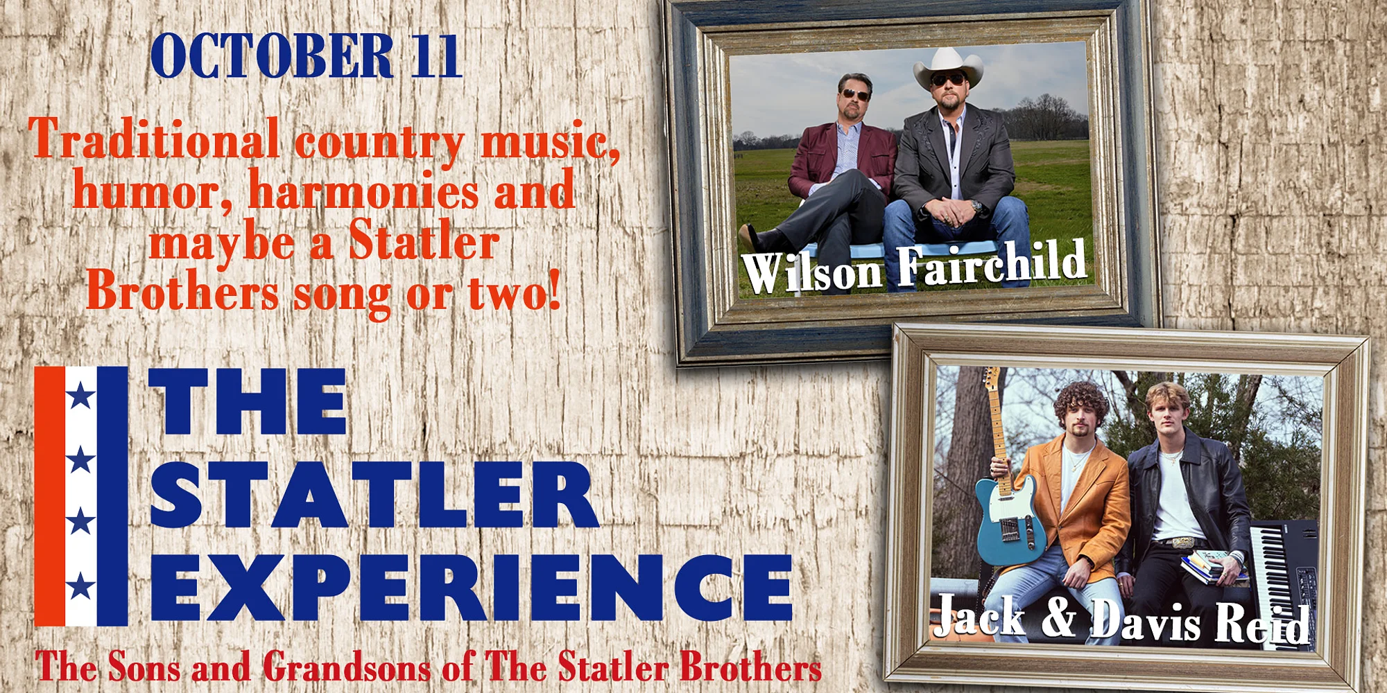 Tickets: $24 $34 $44 AMT Member Pre-Sale: Wednesday, March 4 at 10:00 a.m. Public On-Sale: Friday, March 6 at 10:00 a.m. The Statler Experience brings the timeless harmonies of The Statler Brothers back to the stage in a heartfelt celebration featuring the next generation of Statler family talent: Wilson Fairchild (Wil & Langdon Reid) and Jack and Davis Reid. As sons and grandsons of original Statler Brothers members, these artists carry not only the sound — but the spirit — of one of country music’s most beloved vocal groups. Audiences will hear classic hits like “Flowers on the Wall,” “Bed of Rose’s,” “Do You Remember These,” and “Elizabeth,” delivered with the rich harmonies, warmth, and authenticity that defined the original quartet. Beyond the music, The Statler Experience offers personal stories, humor, and behind-the-scenes memories that connect generations of fans to the heart of the Statler legacy. It’s more than a tribute — it’s a family tradition brought to life on stage. If you cherish classic country, tight harmonies, and songs that stand the test of time, this is an evening you won’t want to miss. For certain concerts, audience members may prefer to stand or dance, especially when encouraged by the artist to do so. Guest expectations differ, so we simply ask all attendees to extend mutual respect toward one another and maintain awareness of those around them. Our staff will only intervene in matters of safety or when behavior is deemed unruly, combative, or disruptive to the overall performance.