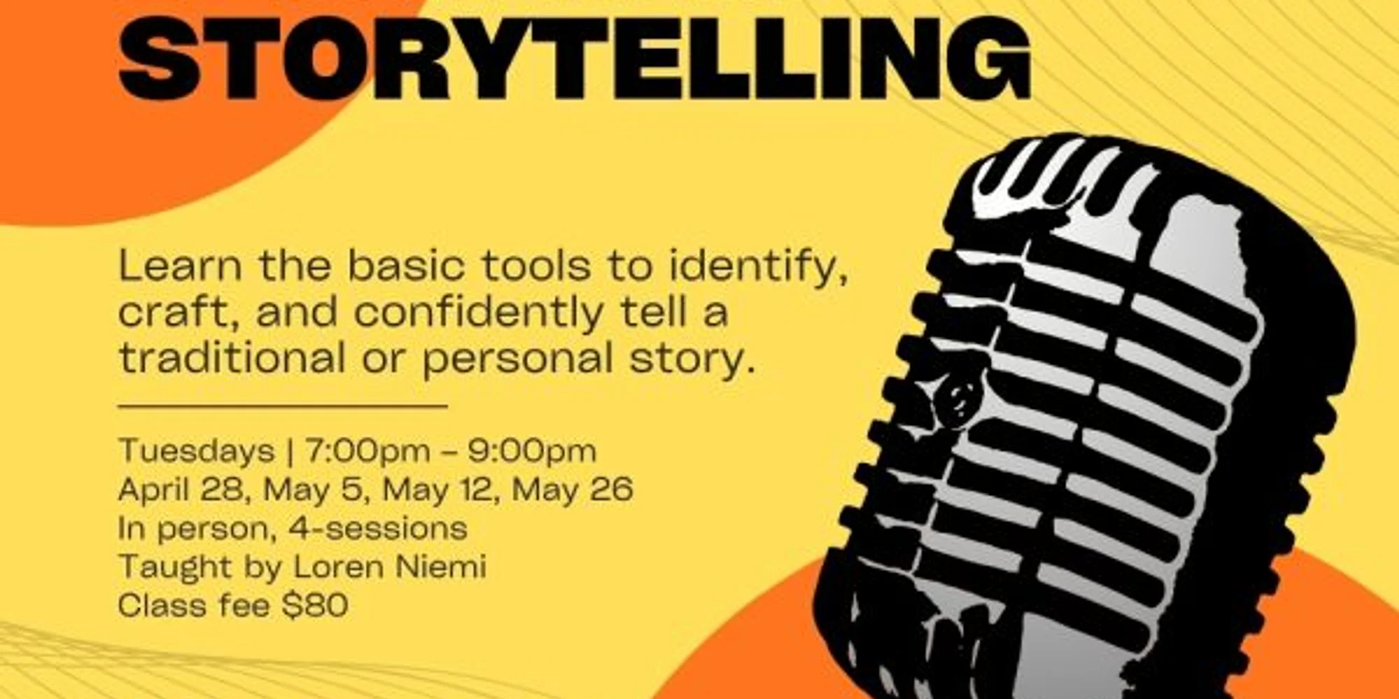 Have you wanted to tell stories? Or better stories? No experience? Some? Heard a Moth program and thought, you could or should try that? This four session hands-on class will give you the basic tools to identify, craft and confidently tell a traditional or personal story. It explores how to identify story seeds from your own lived experience, useful plot forms that structure narratives and can transform how you write or tell stories and critical choices of point of view – First person, Second, and Third Person – in Past or Present tense that frame who is telling the tale and the fundamentals of saying it out loud. In-person, 4 sessions, 7:00-9:00 pm Tuesdays, April 28, May 5, May 12, May 26 Taught by Loren Niemi To register: Add the number of tickets you want by clicking the ‘+’ button Click the ‘Get Tickets’ button Note- After purchase, tickets & receipt may arrive in your ‘Junk Mail’ folder
