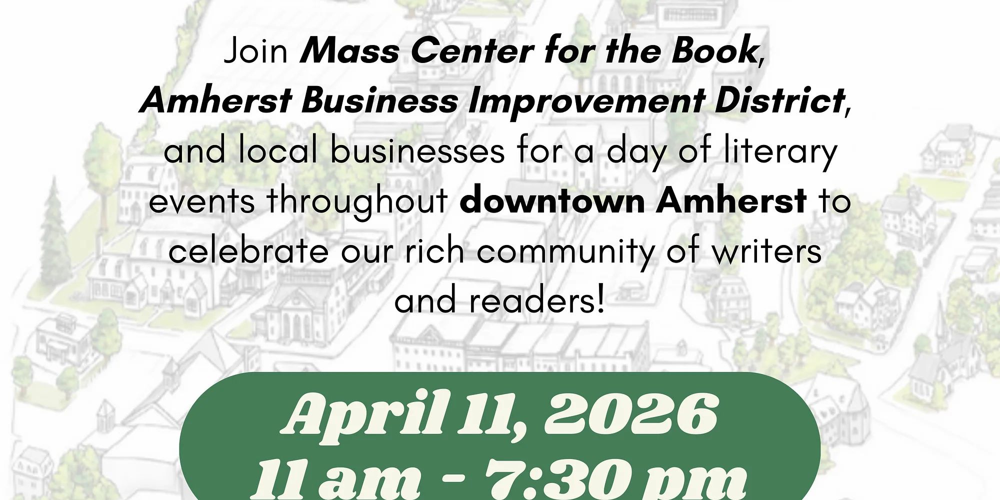 Join us for a stroll through Downtown Amherst and a day of free events celebrating local literary culture! Mass Center for the Book and the Amherst Business Improvement District are partnering with downtown businesses and organizations to provide a day of author readings, poetry, local history, workshops, giveaways, and more!