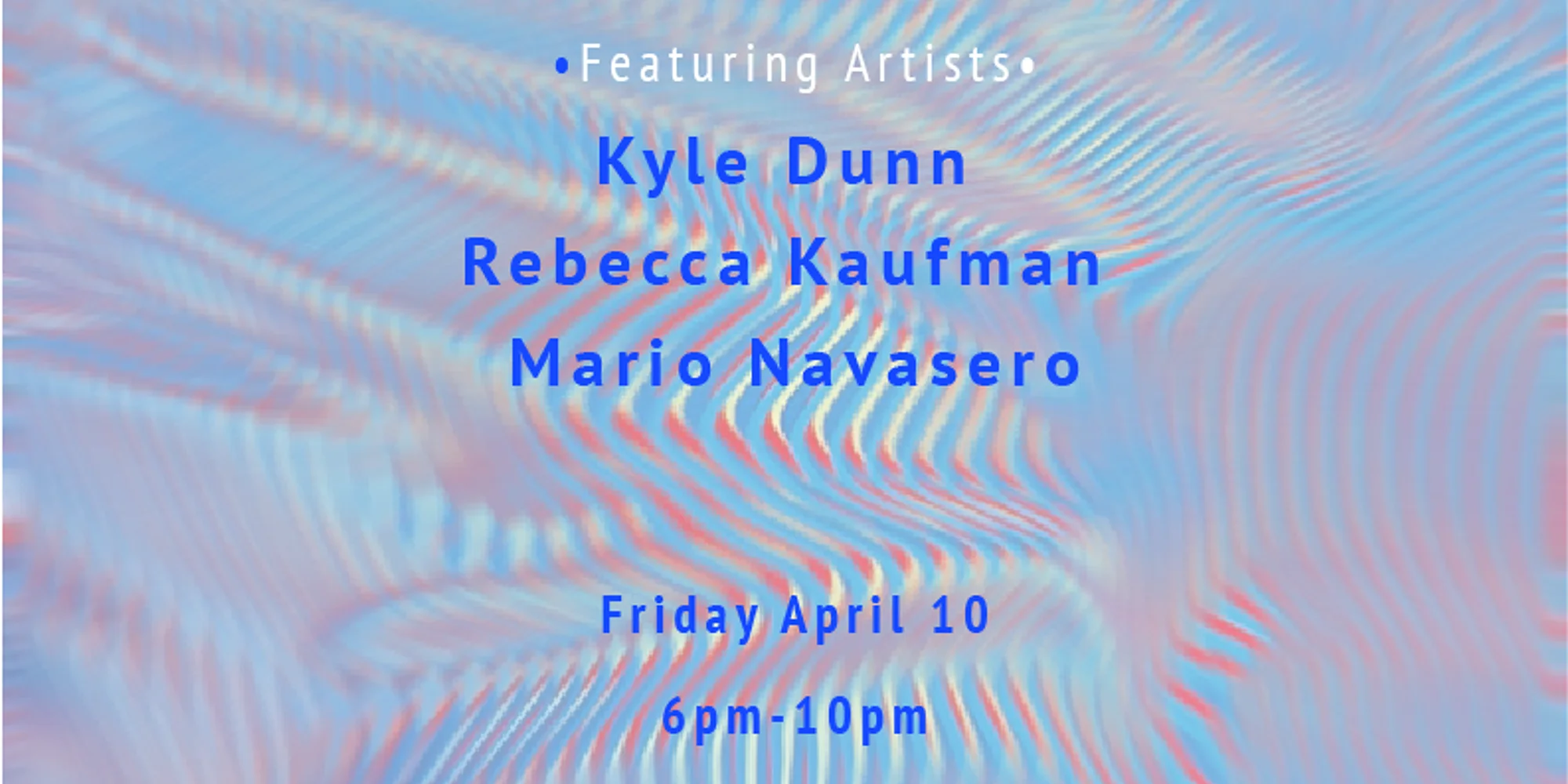 4.10 Friday 6PM-10PM — Exhibition Opening: “Liquid Lines” KYLE DUNN, REBECCA KAUFMAN, & MARIO NAVASERO curated by CLARE EVAAbstractions, illusions, and LIQUID LINES Eventbrite