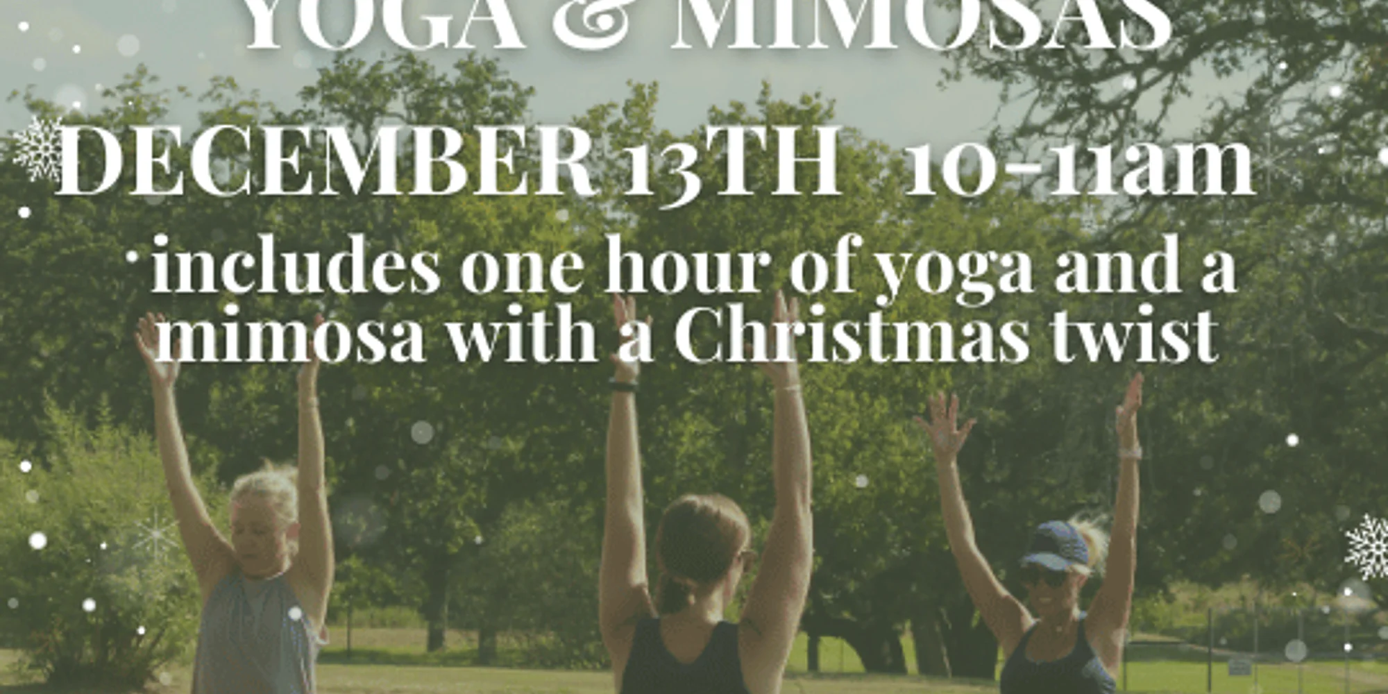 Join us on December 13th at 10:00am for our Christmas-themed Yoga & Mimosas! Tickets are $30. Enjoy an hour of gentle yoga starting at 10am, followed by a mimosa with a Christmas twist. Bring your own mat. Class will be inside. We hope to see you there! Purchase tickets here!