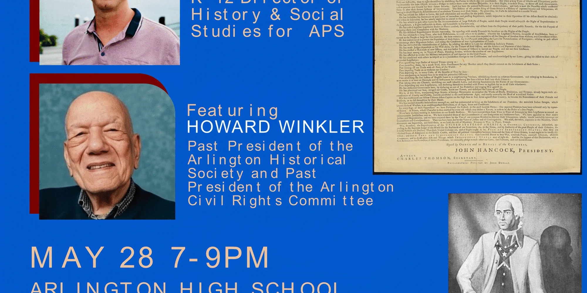 The Arlington Human Rights Commission invites the community to a talk and a conversation on the Declaration of Independence and its meaning for us today. At Re-Examining Our Roots: The Declaration of Independence at 250, moderator Michael Kozuch, K-12 Director of Social Studies and History for the Arlington Public Schools, will present historical background on the Declaration and its continuing importance. Break-out groups will then discuss key concepts in the Declaration and how they are relevant today. Howard Winkler, former Arlington Historical Society President and past president of the Arlington Civil Rights Commission, will conclude with a tribute to Black Bostonian abolitionist Prince Hall, who argued that the Declaration’s assertion that “all men are created equal” applied to all Black people, and to whom a marker in the Black Masonic burial ground in Arlington is dedicated. Join us May 28, 7-9 p.m., at Arlington High School. Free and open to the public. Refreshments will be provided. Register here.