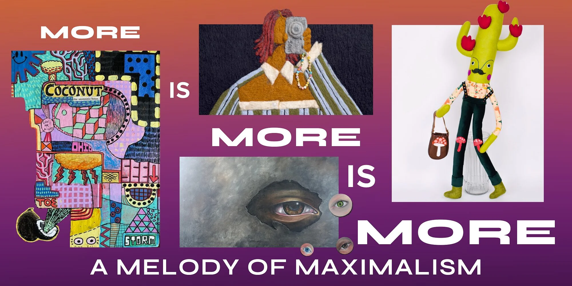March 19, 2026 | 6 pm – 8 pm | FREE Join Art Center Waco for the opening reception of More Is More Is More, a vibrant group exhibition. Featuring works by Nichól Brinkman, Niki Dionne, Ivette Ramos Levy, and John Storm, this exhibition brings together soft sculpture, fiber, painting, ceramics, collage, and mixed media in a dynamic exploration of identity, memory, humor, and everyday life. Meet the artists, enjoy refreshments, and experience a joyful, immersive celebration of maximalist art. Select works will be available for purchase.