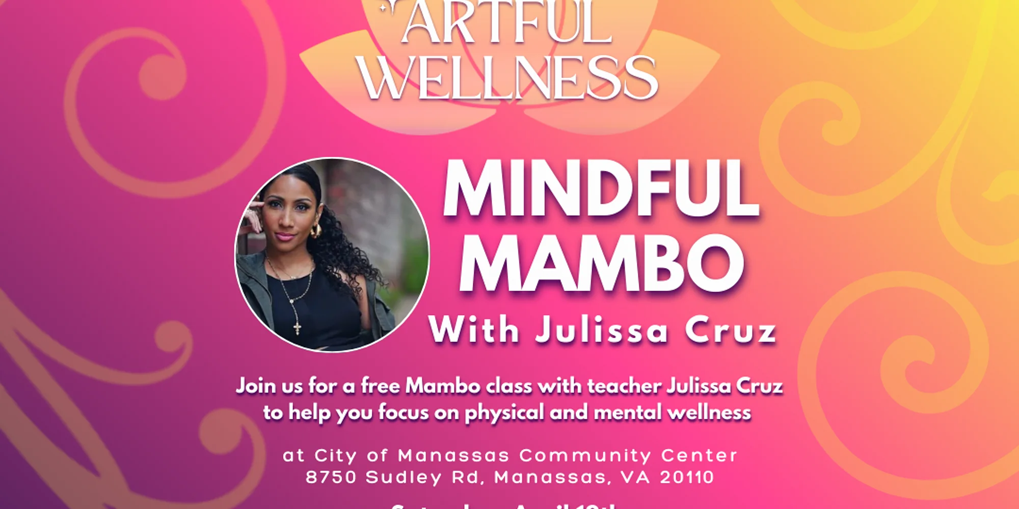 2026 is the year to give back to yourself, and this class is sure to get you moving in the right direction! In a world full of multitasking and long to-do lists it’s easy to be overwhelmed. Practice mindfulness with a mambo lesson with Julissa Cruz, where you explore being present with yourself and other dancers in connecting with the cultural music bringing awareness to your body and your mind in movement. Students of any level and experience are welcome to attend, and partner dancing will not be a requirement. Please note that this class meets at the City of Manassas Community Center! Ages 15+ Saturday, April 18th 10:30 am – 12 pm Registration Fee: Free! This free wellness class is brought to you in partnership with the City of Manassas.