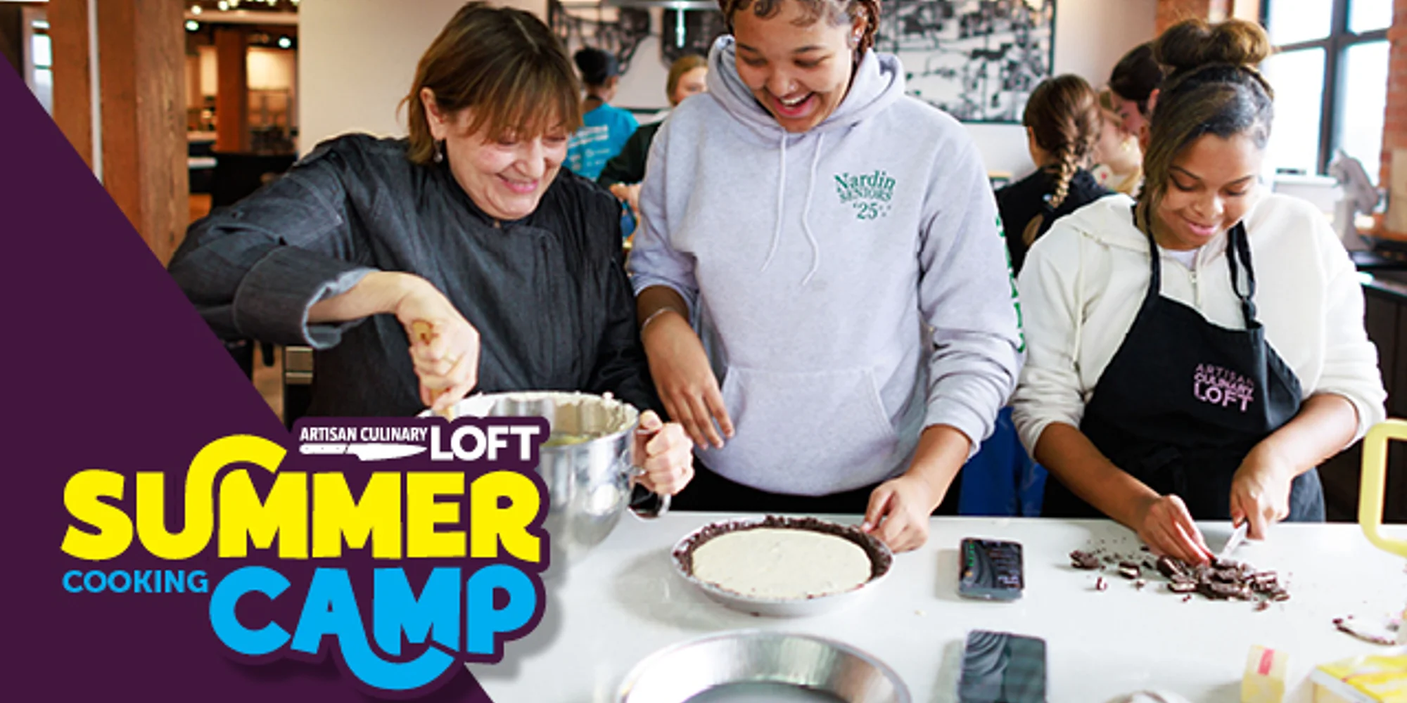 Cooking Class Description: Designed for ages 12 and older, this series combines creativity with essential culinary skills as teens dive into the world of baking and pastry. Throughout the week, they’ll master foundational techniques used by professional bakers—ranging from decadent desserts to healthy snacks from all around the world. Guided by a professional chef instructor, they’ll explore the science behind doughs and emulsions, develop precision and patience and craft desserts worthy of a pâtisserie. Daily MENUS Day 1 Chocolate! Double Dipped Chocolate Truffles Triple Chocolate Brownies Chocolate Chipotle Cookies LUNCH: Chicken Empanadas, Fresh Greens Salad Day 2 American Whoopie Pies Brownie S’mores Bars Pastry Hearts Lemon Bars LUNCH: Jamaican Beef Pies, Fresh Greens Salad Day 3 Healthy Snacks Energy Bars with Fruit & Nuts Homemade Granola for Yogurt Parfaits Peanut Butter Protein Balls Power Cookies LUNCH: Chicken Pot Pies, Fresh Greens Salad Day 4: French Pastries Classic Macaroons Eclairs Ice Cream Profiteroles Chocolate Mousse LUNCH: Croque Monsieur Sandwiches, Fresh Greens Salad Day 5: Cakes & Pies Lemon Poppyseed Cake Raspberry Cheesecake Butterscotch Banana Cream Pie LUNCH: Italian Meat & Cheese Stromboli, Fresh Greens Salad What To Expect: In our classes you’ll work together with other students (in groups of 4-5), sharing work stations in a fun, hands-on environment led by our professional chef instructors. Classes are 5 hours. Hands-on classes are limited to 16 students. $600 per student Monday-Friday 10-3 Early drop off and late pick up offered at an additional price Our Camps Includes: 3+ hours of hands-on cooking Hot sit-down lunch Two professional chefs plus assistants All fresh and natural ingredients Chef hats to keep and aprons to wear Chilled filtered water and sparkling water