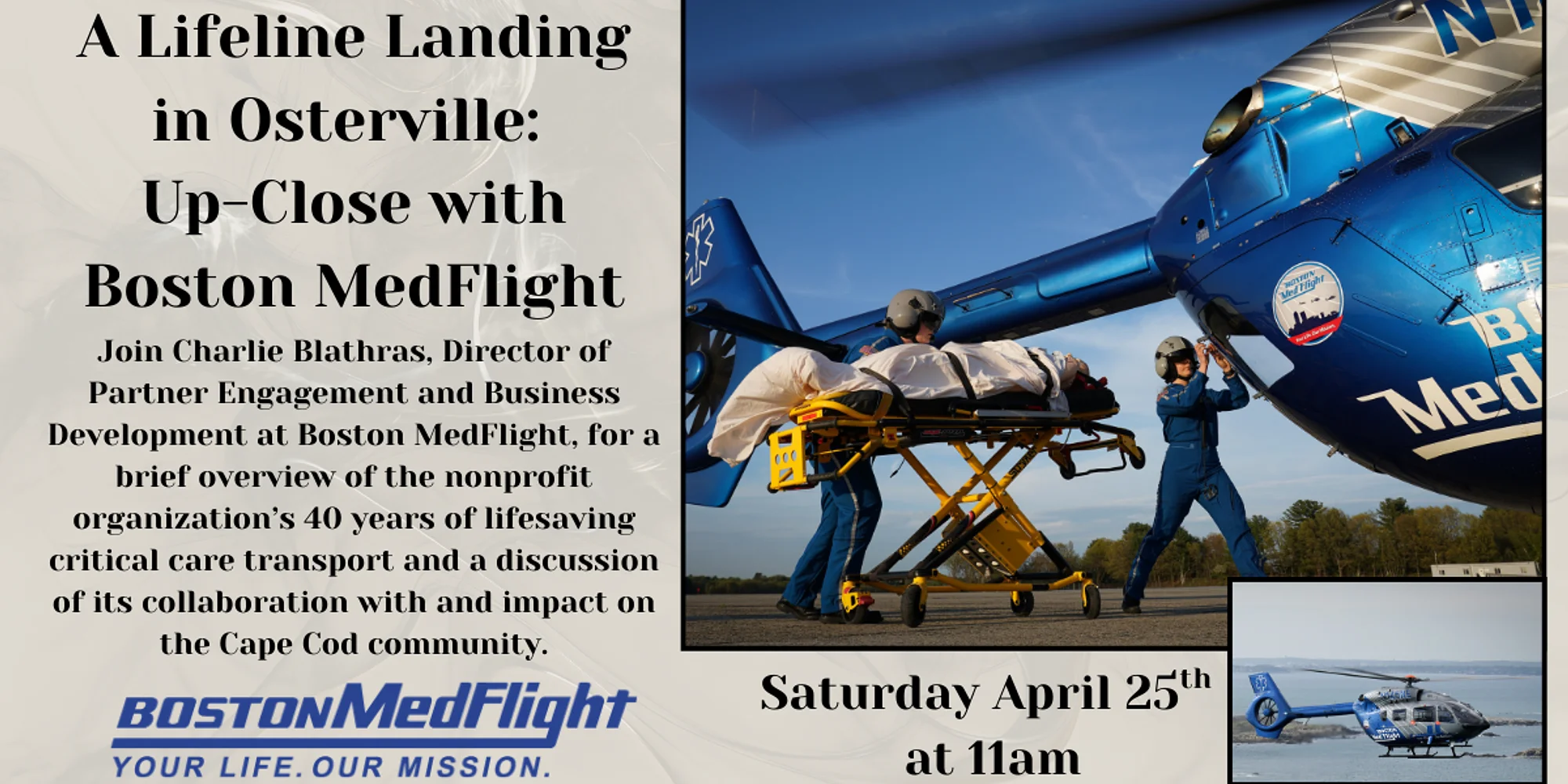 Let’s explore Boston Medflight! Join Charlie Blathras, Director of Partner Engagement and Business Development at Boston MedFlight, for a brief overview of the nonprofit organization’s 40 years of lifesaving critical care transport and a discussion of its collaboration with and impact on the Cape Cod community, particularly here in Osterville. After the presentation, guests will have the opportunity to get an up-close look at and explore the organization’s Freightliner ground ambulance—equipped to operate as an ICU on wheels! For more information or to register for this program, please contact Amy Wolfe at awolfe@clamsnet.org or by calling the OVL directly at (508)428-5757
