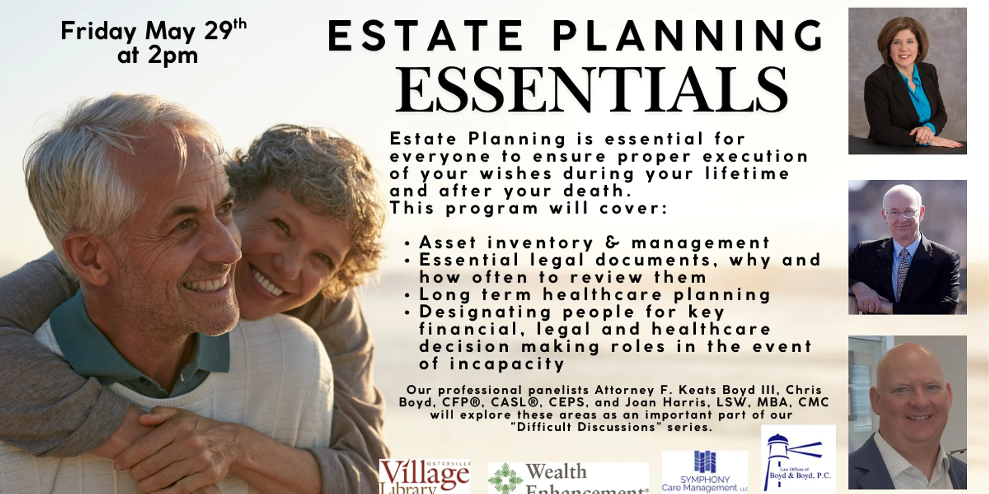 “Estate Planning Essentials” Friday May 29th at 2pm Osterville Village Library Estate Planning is essential for everyone. It ensures proper execution of your wishes during your lifetime and after your death. Our professional panelists will explore these areas as an important part of our “Difficult Discussions” series. Asset inventory & management Essential legal documents, why and how often to review them Long term healthcare planning Designating people for key financial, legal and healthcare decision making roles in the event of incapacity Our Panelists: Attorney F. Keats Boyd, III is a shareholder and President at the Law Offices of Boyd & Boyd, P.C. where for 35 years he has concentrated his practice in the areas of Estate, Trust & Retirement: Planning, Administration & Management, Asset Protection Planning, Business & Succession Planning, Charitable Planning, Elder Law, Special Needs Planning, Tax Law and Trustee Services. Chris Boyd, CFP®, CASL®, CEPS, is a Senior VP and Financial Advisor at Wealth Enhancement Group. For over 30 years he has guided families through the financial realities of aging, long‑term care, and shifting responsibilities. Known for his empathetic fiduciary approach, he also hosts the personal finance podcast Something More with Chris Boyd. Joan Harris, LSW, MBA, CMC, is the Founder, Managing Partner of Symphony Care Management, LLC. a full-service Care Management and Life Planning Company. She developed Aging GPS: Goals, Priorities, Strategies, a specialized planning program for older adults. Joan is also a Fellow of the Leadership Academy, Aging Life Care Association and past president of the New England Chapter with 40 years of professional social work experience. This program will take place on Friday May 29th at 2pm in the Main Meeting Room at the Osterville Village Library. For more information or to register for this event, please contact Amy Wolfe at awolfe@clamsnet.org or by calling the OVL directly at (508)428-5757