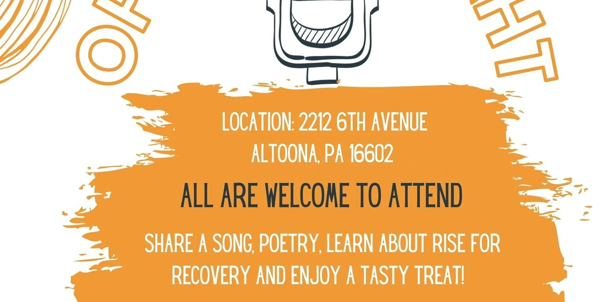 Rise for Recovery Presents OPEN MIC NIGHT Get your singing and listening skills dusted off, Rise for Recovery is back with Open Mic Night in partnership with ArtsAltoona! Thursday April 30 from 6-8pm The Grotto at the ArtsAltoona Center 2212 6th Ave. Altoona Free for all to attend and participate! Get together with some of the most talented people in recovery to show off those singing skills in a safe, supportive and FUN environment! We are excited for this new partnership and cannot wait to see (and HEAR ) you all there!
