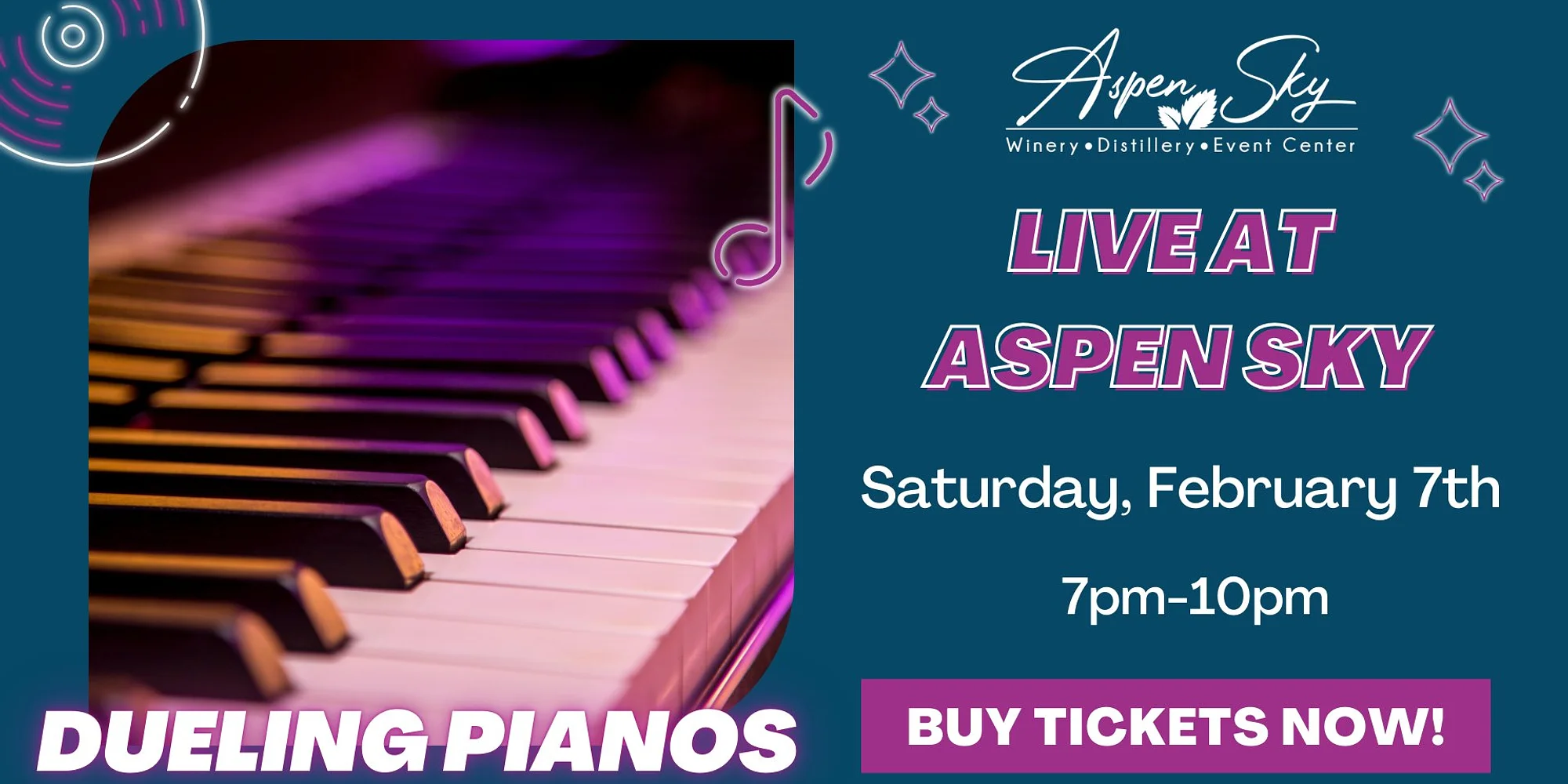 🎹 Dueling Pianos at Aspen Sky! 🎹 We’re so excited to welcome back our Dueling Piano performers for another high-energy, crowd-favorite show! 🎶✨ This interactive experience will have you singing, clapping, laughing, and even dancing along as the pianists battle it out with your favorite songs and requests. 📅 Saturday, February 7 ⏰ 7:00 PM – 10:00 PM 🚪 Doors open at 6:00 PM Come early, grab a glass of Aspen Sky wine or a handcrafted cocktail, and settle in for an unforgettable night of live entertainment. 🍷🍸 🎟️ Tickets sell out fast—don’t wait to grab yours! Seating Options: General Admission (GA): Includes one chair at a shared GA table. VIP Table: A full table for up to 10 guests. Perfect for groups who want the best view and experience.