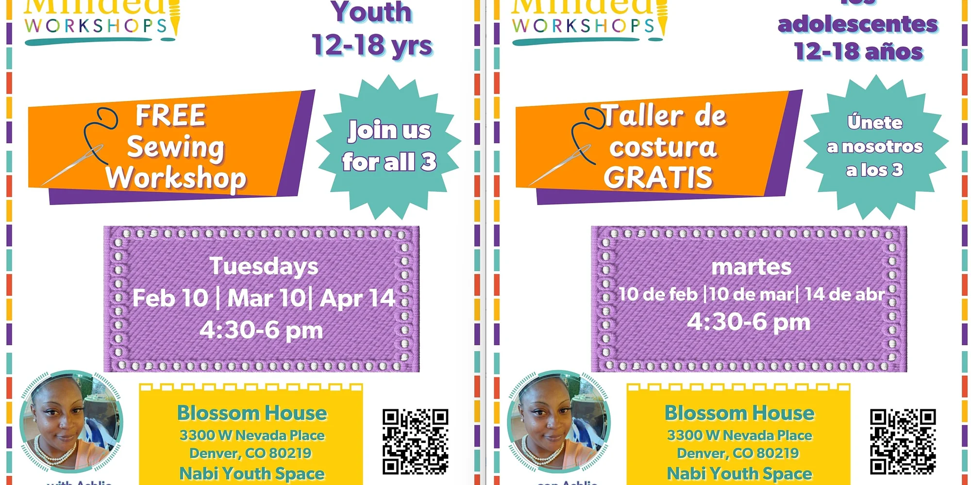 Artfully Minded Workshops – FREE Sewing Series at Blossom House! Join us for a creative spring lineup of hands-on sewing workshops taught by teaching artist Ashlie ‘Chyna’ Bronson. In this fun and supportive session, you’ll learn how to make pillows! Workshop runs from 4:30–6:00 p.m. in the Nabi Youth Space at Blossom House- 3300 W. Nevada Pl, Denver CO, 80219 Whether you’re a beginner or brushing up your skills, you’ll leave with something handmade at every class. Come for all three—and sign up today! ¡Serie de Costura Gratuita en Blossom House! Únete a nosotros para una creativa serie de primavera con talleres prácticos de costura impartidos por la artista Ashlie “Chyna” Bronson. En este divertida y apoyo, aprenderás a hacer almohadas! Los talleres se llevarán a cabo de 4:30 a 6:00 pm en el Nabi Youth Space, ubicado en Blossom House (3300 W. Nevada Pl, Denver, CO 80219). Tanto si eres principiante como si deseas perfeccionar tus habilidades, te llevarás algo hecho a mano en cada clase. ¡Ven a las tres y apúntate hoy mismo! Meet the Teaching Artist Ashlie ‘Chyna’ Bronson After completing her Bachelor’s degree in fashion design and attending the Art Institute of Denver Colorado, Ashlie founded Chi Marie Fashions 16 years ago. In May of 2023, she joined the Denver design incubator to pursue her passion for teaching individuals interested in either becoming fashion designers or improving their sewing skills. For her, learning how to sew equals power and money, and she stands by her motto that when you look good, you do good! facebookinstagram