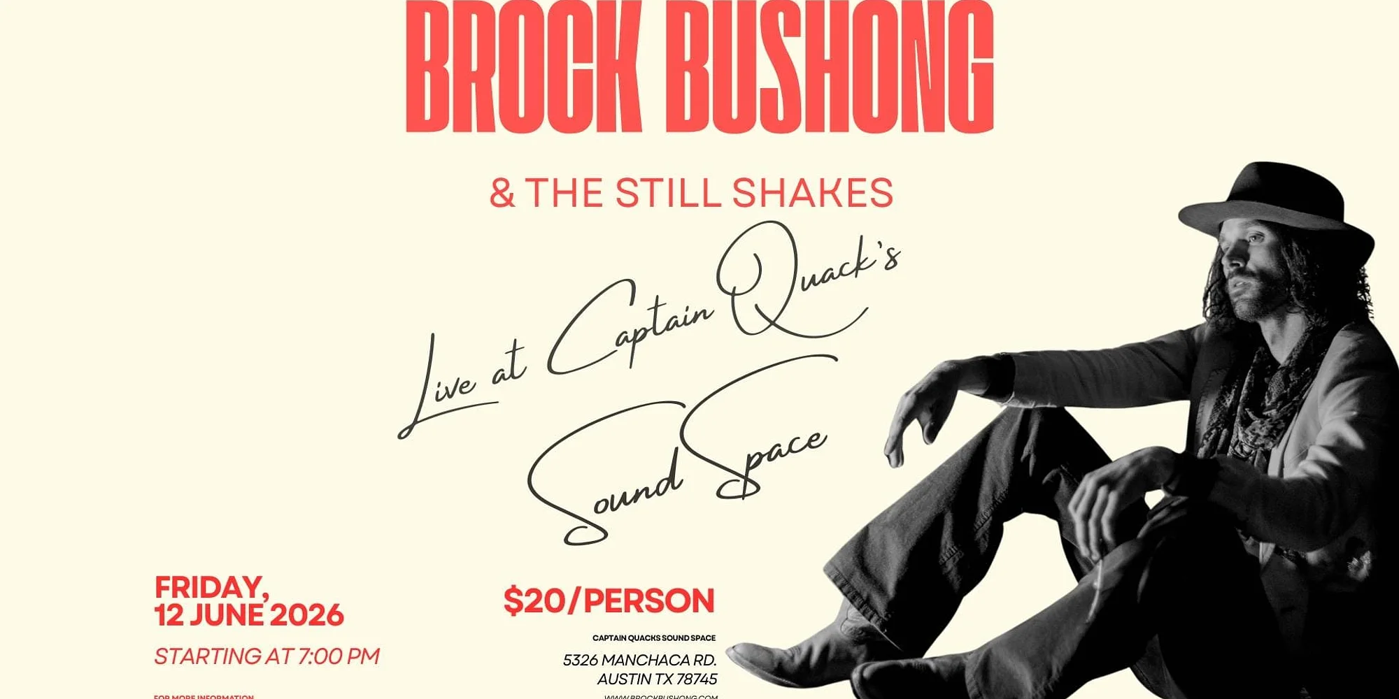 Join us for an evening with Brock Bushong & the Still Shakes Come spend the night with Brock Bushong & The Still Shakes at Captain Quackenbush’s Sound Space in Austin on June 12th. Expect gritty Texacana tunes, loud guitars, and a great crowd. It will also be one of Austin’s first chances to grab a signed copy of the band’s first vinyl. $15 presale / $20 at the door. Come see us. 🎸 Doors 6:30 Show 7pm