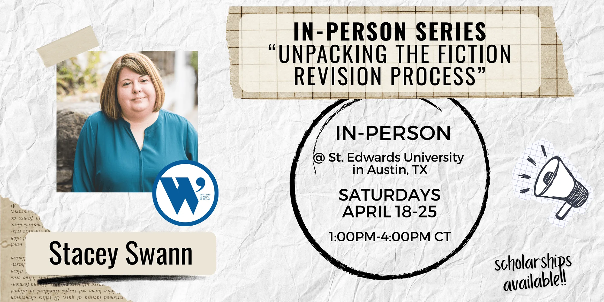 $150 for Members $270 for Non-Members In this two-session class, writers will explore the different aspects of the revision process through the lens of their own short story or novel excerpt. Through craft readings, discussions, and targeted exercises, students will bring renewed energy and fresh perspectives to their work in progress. Writers at every stage can be daunted by the process of revision. It’s easy to see that something we’ve written isn’t working; it’s much harder to pinpoint why it isn’t working. In this class, we will break the revision process into separate pieces in order to better understand it. Each week’s class will include craft readings, group discussions, and writing exercises to help us return to our own work with new techniques. Whether you are working on a short story or a novel, this two-session class will give you confidence to return to your projects with renewed energy and fresh perspectives. This is an in-person class series, taking place in Austin, TX. This class series will be held in the Munday Library (3001 S Congress Ave Building LIBR, Austin, TX 78704) at the St. Edwards College campus across two Saturdays. It will not be recorded, or made available online. There will be paid parking ($6/day) available onsite if you pre-register your car. There is also a bus stop within walking distance, serving route 1 and route 486. More details will be provided prior to the first class date. Individual Class Details Class 1 (April 18 from 1:00-4:00 PM CDT): The Big Picture: Taking a step back from our manuscripts, we’ll get a long shot of our plot and structure choices that allows us to see what rooms may still need to be added and what walls might need to come down. We’ll also examine our characters and how to best render them on the page through the power of exposition, interiority, and point of view choices. Class 2 (April 25 from 1:00-4:00 PM CDT) A Closer Look: As the next draft of your piece begins to clarify for you, we’ll revisit the ideas and inspirations that first drew us to our project and track how its themes may have evolved. Then we’ll hone in on the micro elements of revision by focusing elevating and refining dialogue as well as achieving maximum clarity and power in our sentences. TAKE THIS CLASS IF: You find the first draft much easier than everything that comes after. You’ve gotten stuck mid-revision. You have a lot of “mostly-done” projects but rarely feel “done-done.” The deadline to register for this class is Friday, April 17 at 5:00 PM CDT. CONTINUING YOUR WRITING JOURNEY SCHOLARSHIP INFORMATION The WLT is committed to making our online classes accessible to all writers including writers who do not have the financial means to pay for programming. Five (5) seats in this class have been set aside for scholarship recipients to attend free of charge. Please note: two (2) of these seats will be reserved for students of St. Edward’s University. Please fill out this application no later...