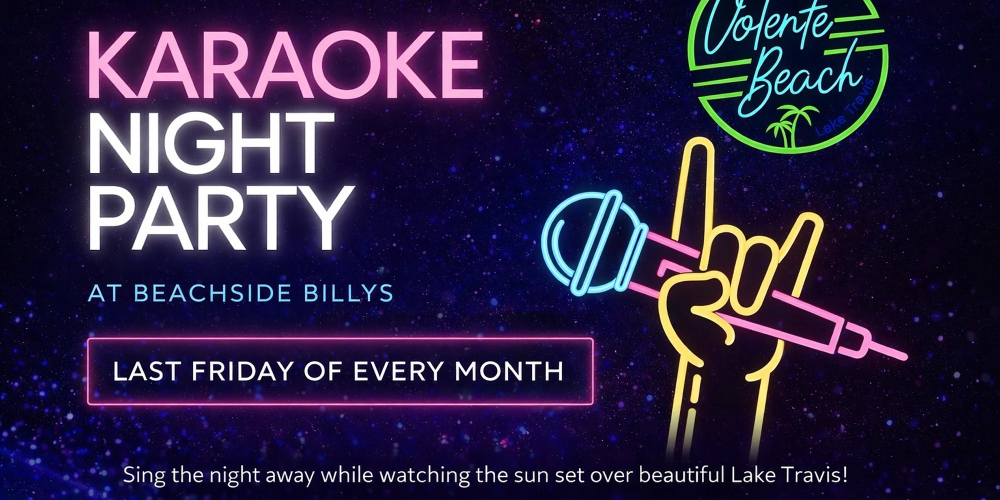 Free karaoke night at Beachside Billy’s on Lake Travis. Sing, sip, and enjoy a fun lakeside night out in Austin. Looking for a fun night out in Austin? Join us for Karaoke Night at Beachside Billy’s, a lively, laid-back evening of music, drinks, and lake views at Volente Beach Resort & Waterpark on beautiful Lake Travis. Whether you’re ready to grab the mic or just want to sit back and enjoy the performances, Karaoke Night is all about good vibes, great music, and an unforgettable lakeside atmosphere. Bring your friends, make it a date night, or come solo and cheer on fellow singers—it’s always a blast. ✨ What to expect: Open-mic karaoke for all skill levels Full bar with cocktails, beer, and wine Food available from Beachside Billy’s Sunset views over Lake Travis Fun, welcoming nightlife atmosphere Karaoke Night takes place on the last Friday of every month and is free to attend. Come early, grab a drink, and get ready to sing the night away by the lake! 🎶🍹