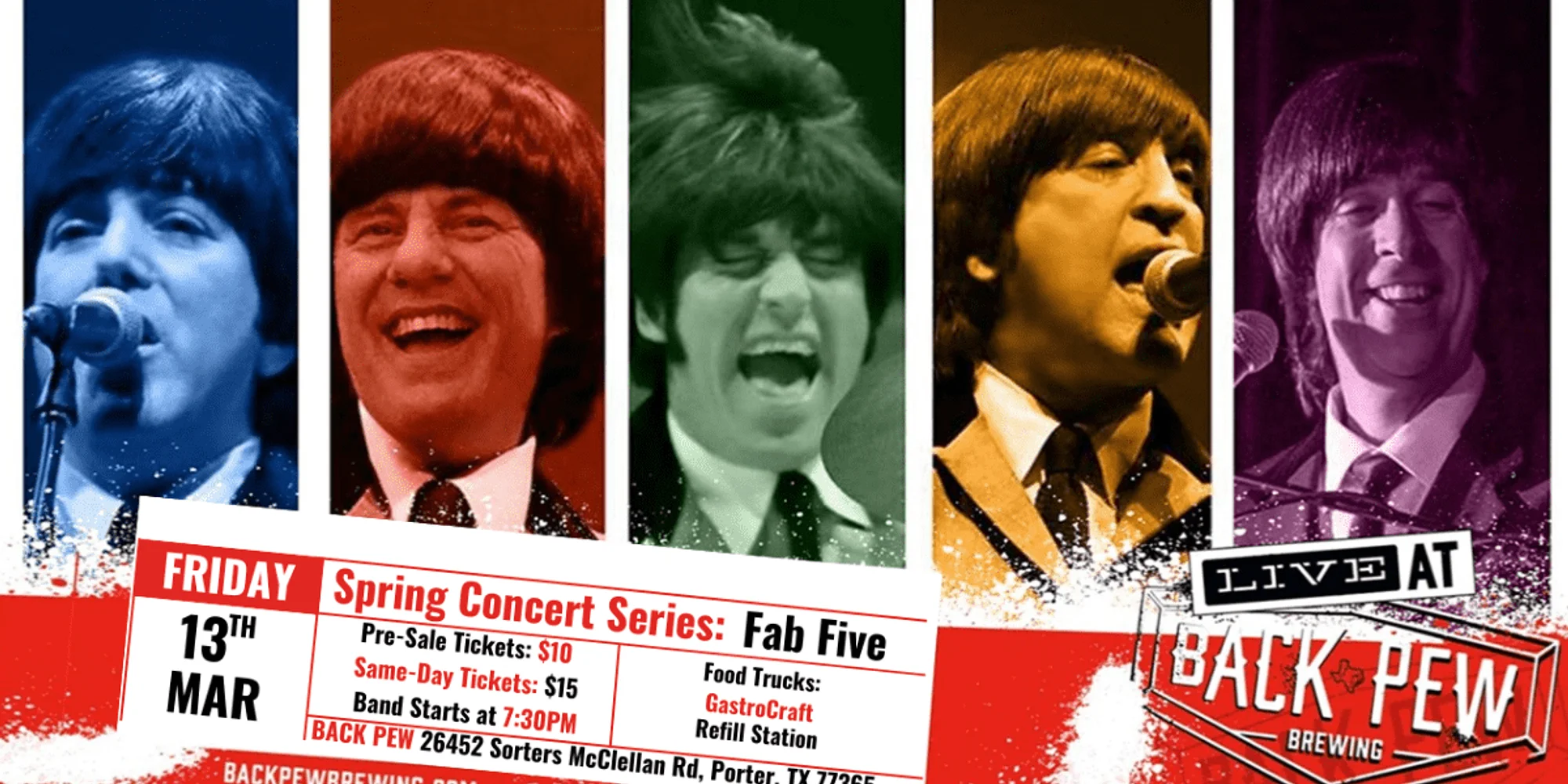 πΈπΌ SPRING CONCERT SERIES KICKS OFF WITH THE FAB 5! πΌπΈ The wait is over β our ππππ ππ©π«π’π§π ππ¨π§πππ«π πππ«π’ππ¬ is officially here! Join us on πππ«ππ‘ ππππ‘ ππ π:ππππ as ππ‘π π ππ π return to ππππ€ πππ° ππ«ππ°π’π§π to launch the season with a Beatles-era celebration you wonβt want to miss. With over 30 years on stage recreating the spirit of the British Invasion and the greatest pop-beat hits of the β60s β authentic sound, vintage instruments, classic style, and pure feel-good energy β this is one of our most requested performances of the year. π΄ Come hungry, because GastroCraftπ and Refill Stationπ will both be on site serving up amazing food all night long! Whether youβre in the mood for savory, sweet, or something in between, youβll have plenty of delicious options to pair with your favorite Back Pew brews while you enjoy the music. ποΈ ππ’ππ€πππ¬ ππ«π π¨π§ π¬ππ₯π π§π¨π°: β’ Special Presale Price: $10 ($5 off until 12PM the day of show) β’ Beer Bundle: $27 (1 admission + 3 beers) β’ Tickets Day of: $15 (after presale ends) Tickets required for ages 12 & up. No refunds unless the show is canceled. Grab yours at the link below π π https://backpew.square.site/ This is the show to kick off the season right β bring your friends, grab a ticket, and make it a night to remember! π