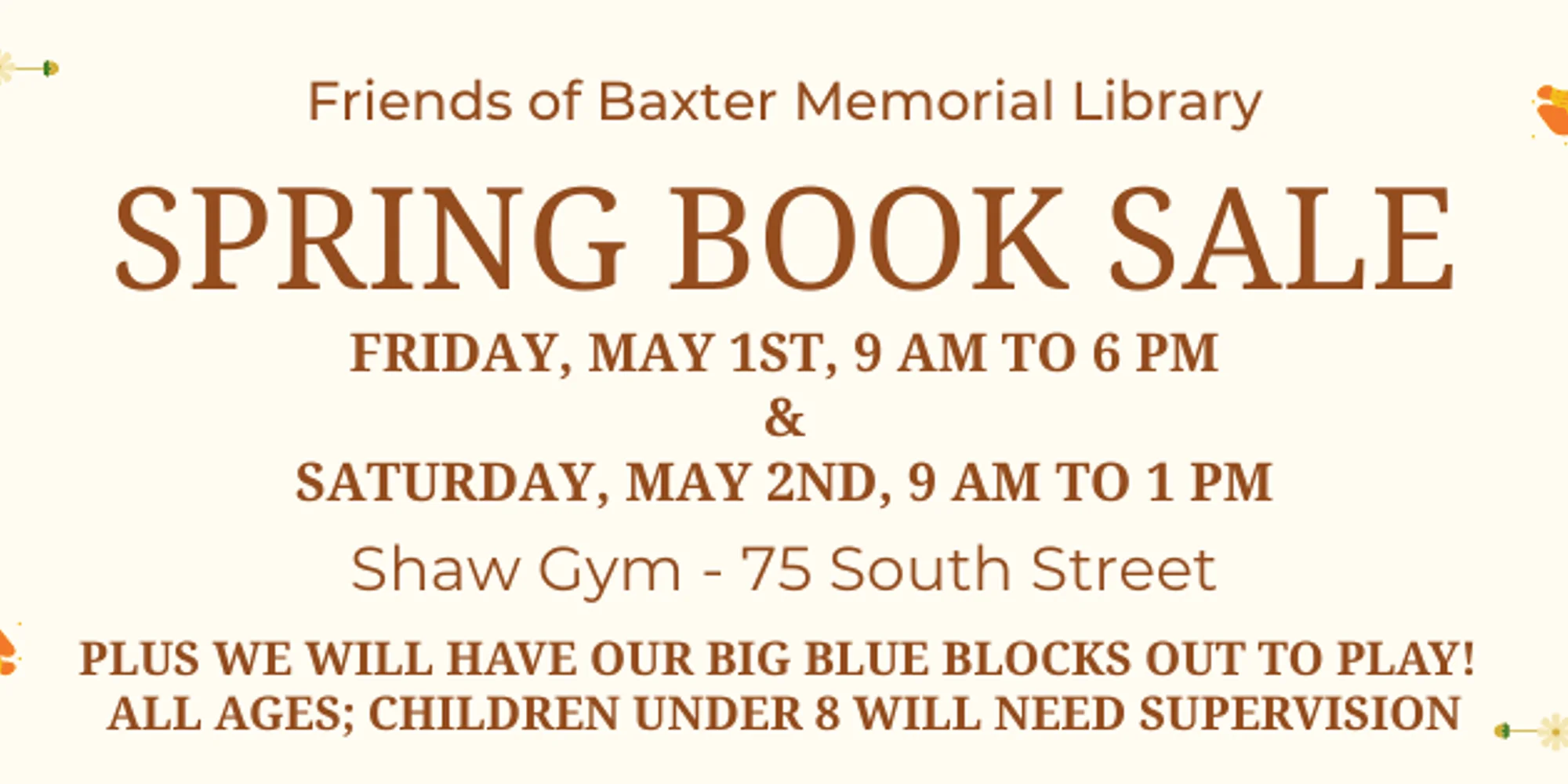 Join us for the Friends of Baxter Memorial Library Spring Book Sale! Friday, May 1st 9 am to 6 pm Saturday, May 2nd 9 am to 1 pm The sale is held in Shaw Gym at 75 South Street. PLUS we will have our big blue blocks out to play! All ages; children under 8 will need supervision.
