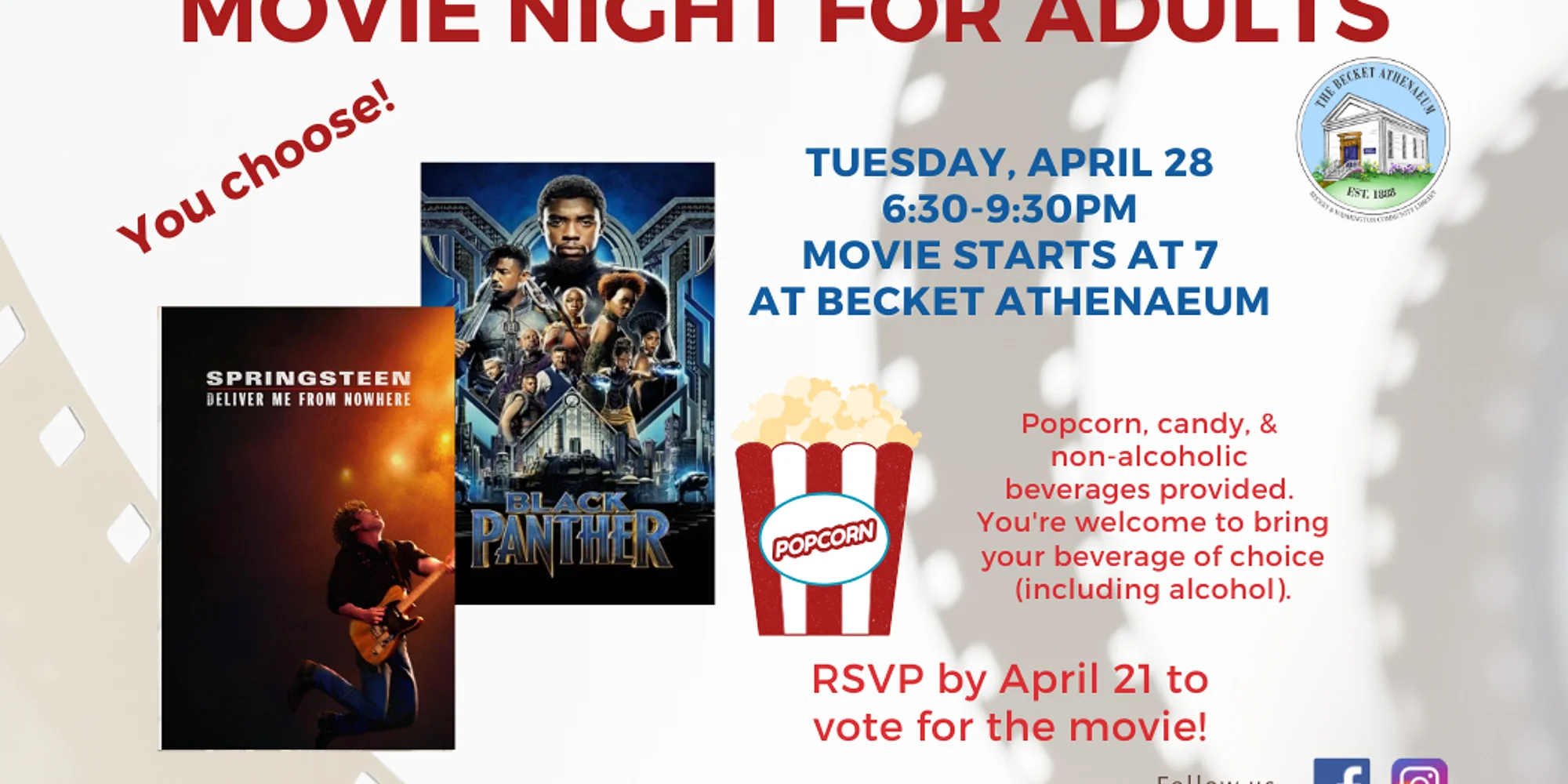 Movie starts at 7pm Popcorn, candy, & non-alcoholic beverages provided You're welcome to bring your beverage of choice (including alcohol) Older children, 13+, may come with an adult at the discretion of their guardian RSVP by April 21 to vote for the movie.