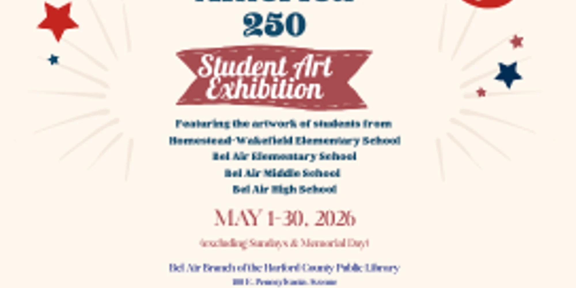 Bel Air America 250 Student Art Exhibition May 1-May 30 (excluding Sundays and Memorial Day) Presented by the Bel Air Cultural Arts Commission in partnership with the Bel Air Branch of the Harford County Public Library and Harford County Public Schools, this exhibit features artwork celebrating the 250th anniversary of our nation created by students from Homestead-Wakefield Elementary School, Bel Air Elementary School, Bel Air Middle School, and Bel Air High School. Exhibition will be on display at the Bel Air Branch of the Harford County Public Library during regular library hours. Admission is FREE!