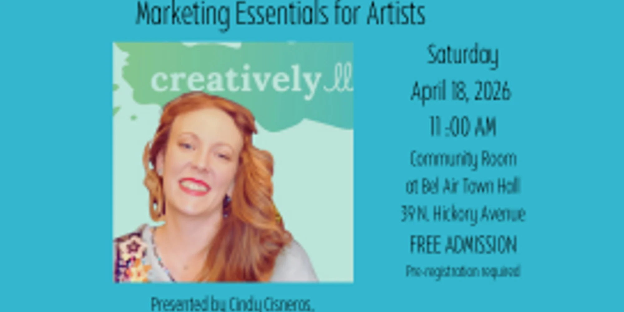 Learn how to turn your passion for art into a profitable business by learning to develop an effective and authentic marketing strategy! Register now for The Business of Art: Marketing Essentials for Artists. In this 60-minute session, artists will learn marketing strategy basics, audience targeting, and choosing platforms. Artists will also learn how to craft a personal brand that reflects their unique voice and message. If you are dreaming of turning your passion for art into a thriving business, this presentation will empower you to create a roadmap to a sustainable career in art! Class will be held on Saturday, April 18, from 11 am to noon in the Community Room of Bel Air’s Town Hall, 39 N. Hickory Avenue, Bel Air, MD. Admission is FREE, but pre-registration is required. Space is limited! Cindy Cisneros, owner of creatively llc, is a certified creativity coach, licensed mental health therapist, and professional artist. Her structured approach to business basics allows for immediate learning and ongoing skills development and ensures that artists have the resources they need to apply their learning effectively. Cindy has been recognized as one of the Top Creativity Coaches by Coach Foundation. Sponsored by the Bel Air Arts & Entertainment District with a grant from the Maryland State Arts Council.