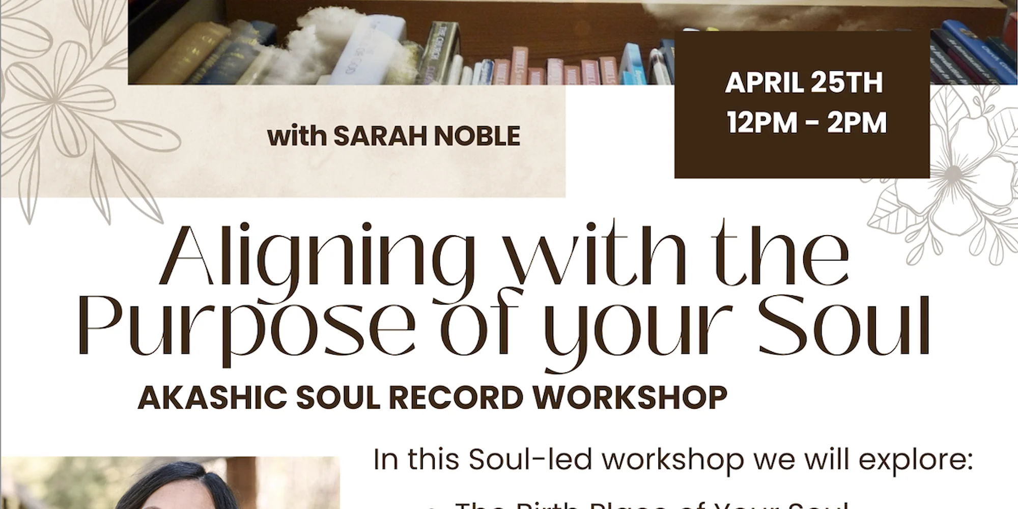 Facilitator: Sarah Noble We have all come here with a divine purpose, traveling on a stream of cosmic dust from the stars into our mother’s wombs, born into this precious life. It is no accident that you are here my love, on Earth, in this moment, in this body. You are here longing to find your place, to align with your purpose, to embody your passions and to live into the dreams of your heart. Yet so often we get caught, suspended in the tangle of life, not able to move forward, not able to find solace and comfort in a world that has forgotten the truth of our existence. As we begin to remember, as we peel back the layers, as we come together to uncover our unique gifts, and reconnect with our authentic selves, we are able to see another way of being, a new possibility, a different life that is waiting to be lived. I have experienced on this complicated and wild journey, that when we connect with the story of our Soul, it will show us the magic of this life that we have been missing. It will open a window into the very heart of who we truly are, of who we came here to BE, and gives us answers to our ever asking… WHY? . In this soul-led workshop we will cover five main areas of your Akashic Soul Record. Where We will gather together to explore the gifts you are here to live into and discuss how you can harness the innate intelligence of your Soul to create a meaningful and joyful life. You will receive an email PDF of your Soul Record prior to our gathering for you to review and get familiar with these facets of your Soul. You will also receive a printed version of your Soul Record at the workshop. An Akashic Soul Record Reading is only done once in your lifetime. It involves accessing the Akashic library and reading your Soul Book, which holds the history of your Soul and doesn’t change between lifetimes. You carry these main characteristics throughout the entire life of your Soul, which can be thousands of years. This reading is different from an intuitive reading that typically focuses on the energy and situations that are currently present in your life. Akashic Soul Record Readings can be very extensive so I love to focus on the five main aspects of your record that I experience to be the most relevant to understanding your current life circumstances and aligning with your purpose. Investment: $155 Must register by end of the day Wednesday, April 22nd. Upon registering: To allow Sarah enough time to research and send you your personalized report please fill out this form.
