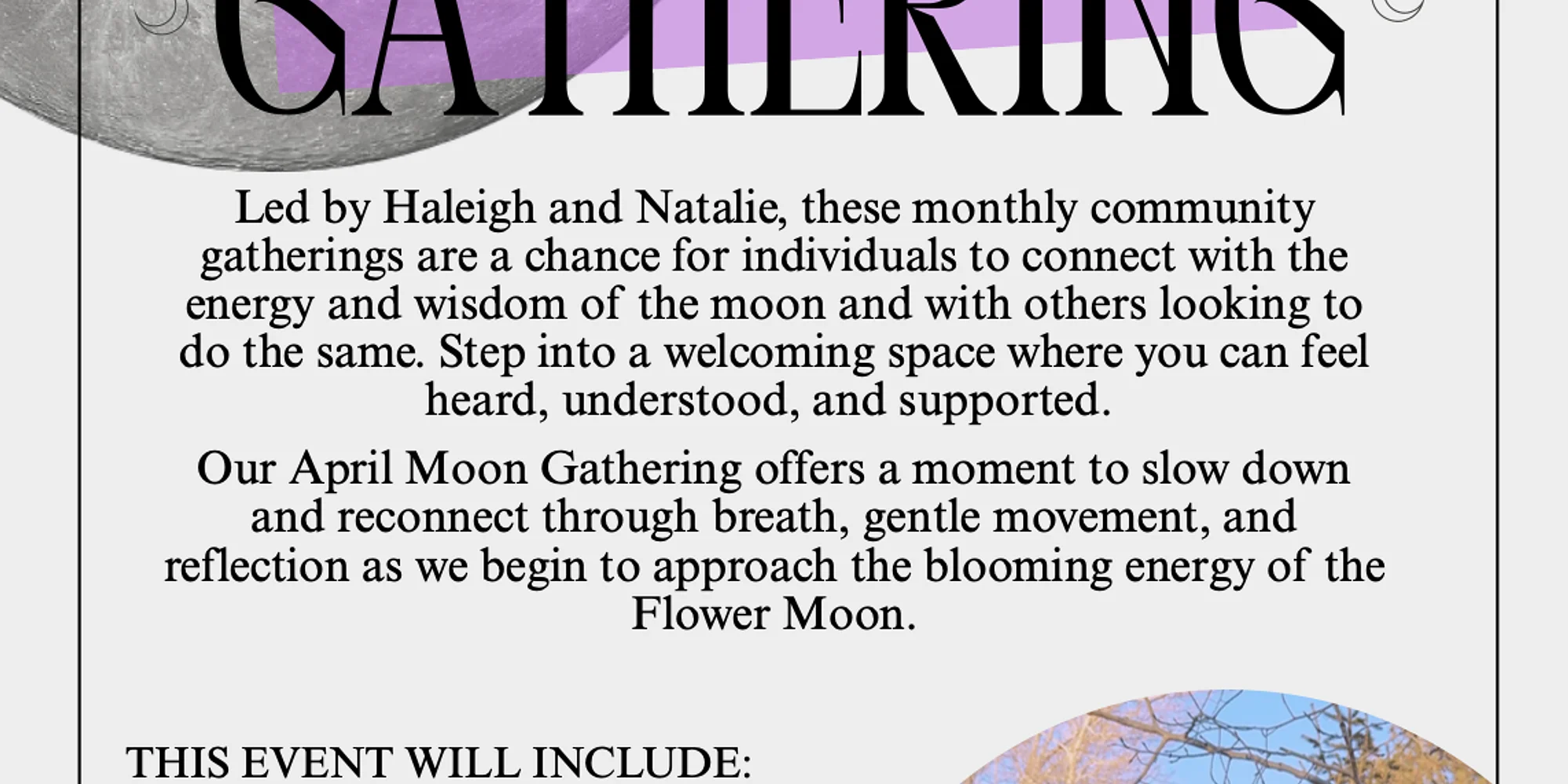 We are guided by the moon in so many ways. Learning how to harness its energy is a beautiful way to call more clarity and positivity into your life. Our Community Moon Gatherings lead by Haleigh Smith and Natalie Colvin are a chance for individuals to connect with the energy and wisdom of the moon as well as with other people looking to do the same thing. They are a welcoming space where you can feel heard, understood, and supported. Our monthly moon gatherings will focus on renewal and regeneration. On turning inward, setting intentions, and putting our dreams in motion. This event will include: – Grounding meditation – A short overview of the lunar phase and how to work with it in a practical way – Time for reflection and sharing – Energy healing and integrative movement