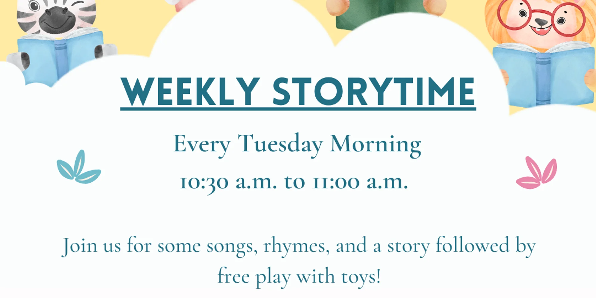 Join us for a weekly interactive storytime every Tuesday from 10:30 to 11:00. Each week we’ll sing songs, move around, play games, and read a book. Every storytime is followed by free play in the children’s room. Whether your little one feels like sitting for a full storytime or needs to wiggle, stand up, and move around during the program, children of all ages and abilities are welcome!