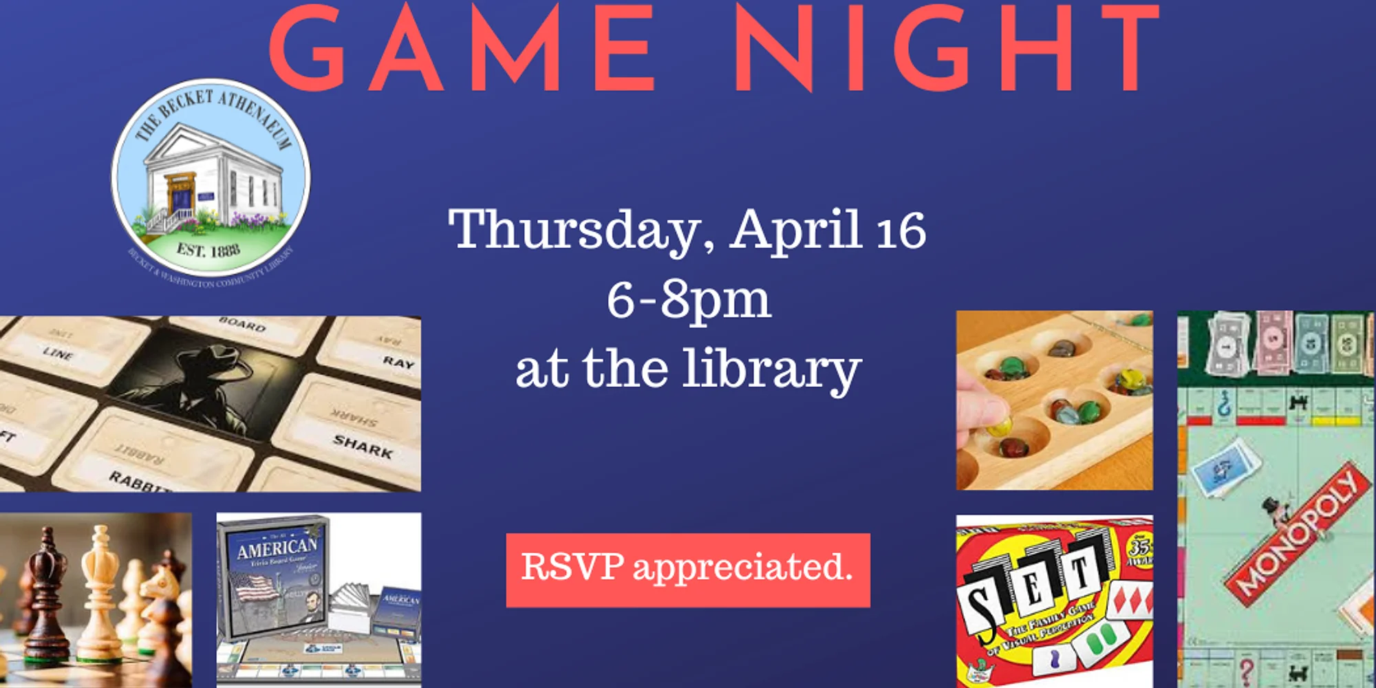 Join friends and neighbors for a fun evening of board and card games! If you have a favorite, please bring it along to share/teach to fellow gamers! Games the Athenaeum owns include Monopoly, Code Names, The All American History Trivia Game, Sorry, Chess, Quiddler (word game), SET, and many more! Refreshments will be served! You're welcome to bring your beverage of choice (including alcohol). Ages 13+ are welcome. Clicking the button below will open an email addressed to info@bwlibrary.org. If that doesn’t work, please just send an email to RSVP. RSVP appreciated.