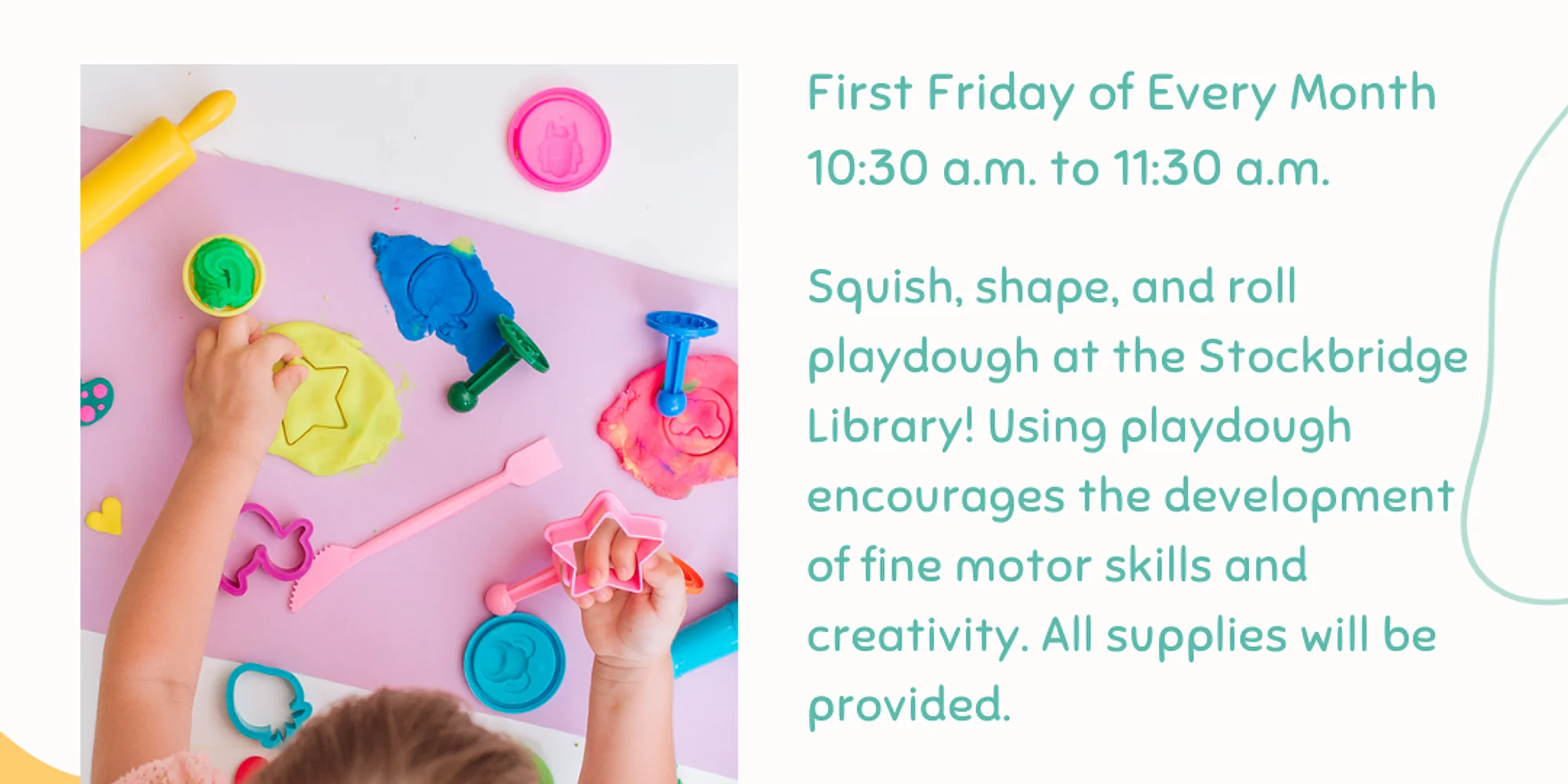 Squish, shape, and roll playdough at the Stockbridge Library! Using playdough encourages the development of fine motor skills and creativity. Join us on the first Friday of every month for this program. All supplies will be provided. *Best for youth age 2+