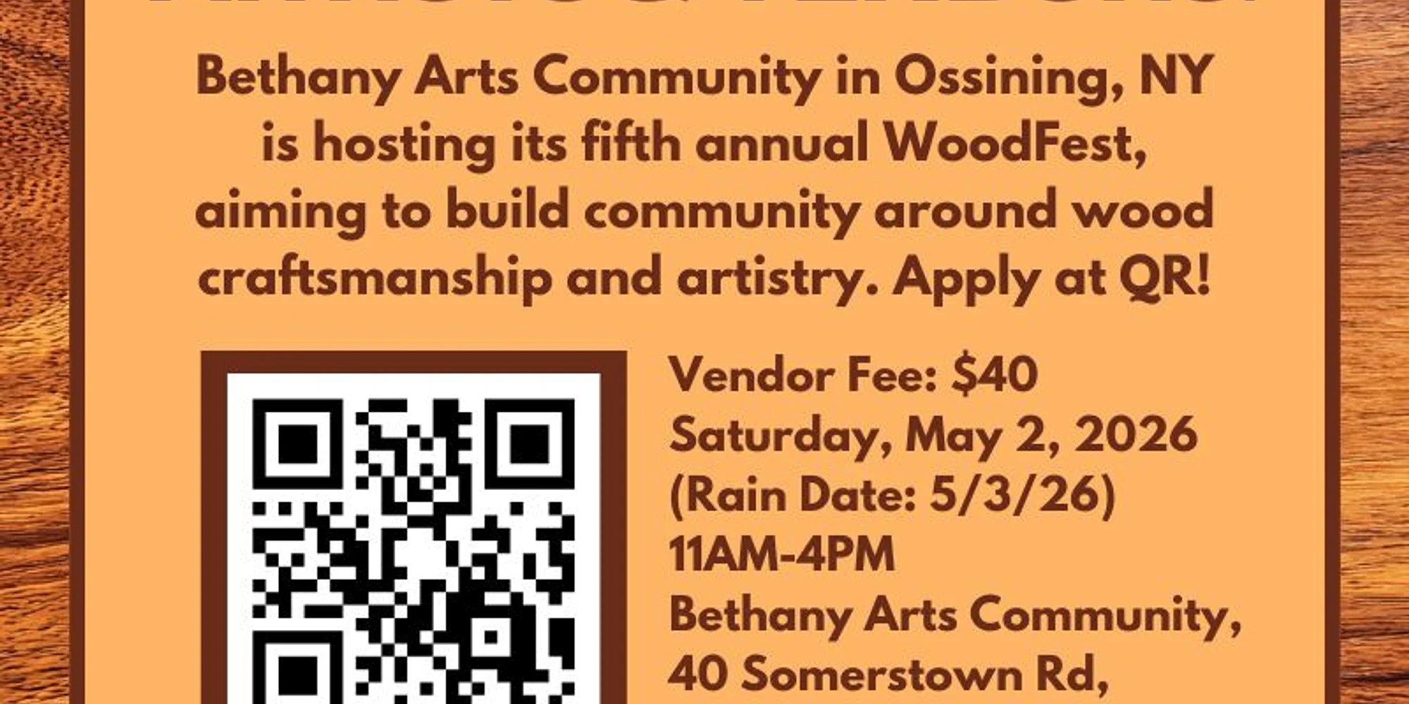 Call for Wood Artisans & Vendors Our vendor/artist application form is open for submissions Application & Approval Required– apply below! WoodFest 2026 will be held on Saturday, May 2, 2026 from 11AM – 4PM with a rain date of Sunday, May 3, 2026. Vendors will be able to arrive as early as 9:30AM to begin set-up, vendors will have until 5PM for load-out. WoodFest 2026 aims to create community around all things wood, from fine arts to construction and beyond. Wood crafters, artists, and workers will have space to share their craft and build community with other wood-loving folks. Every year at WoodFest we host live music, wood/nature-based activities/crafts for kids & adults, food, our vendor village, and always have surprises in store! Our annual WoodFest has seen over 350 attendees and we hope to break that record this year. VENDOR REQUIREMENTS Vendors are required to bring their own tables, chairs, tent (with weights), payment processing equipment, etc. BAC will provide a 10’x10′ space and power hook-up for an additional fee (+$10). For individual artists and small businesses (1-10 employees), the cost of tabling is $40. Returning individual/small business vendors from previous years will receive a $10 discount. For all businesses (LLCs, Corps, etc.) attending WoodFest, we require a Certificate of Liability Insurance (COI) with Bethany Arts Community Inc. listed as the additional insured. To discuss your business (10+ employees) attending WoodFest and for Sponsorship opportunities, please contact Nancy Zallo at nancyz@bethanyarts.org. For this year’s WoodFest, we are expanding and deepening our sustainability focus, we ask that you join us! Please no styrofoam or plastic wrapping, bags, bottles, giveaways or other single use giveaways; any waste producing activities or packaging must be recyclable or compostable. If you have any questions or need support in preparing for the festival, please contact Lexi at alexar@bethanyarts.org. If you are interested in performing a wood-based demo at your table, let us know below so we can add you to the demo list for the day.After rolling application approval (usually 1 week after submission) via email from Lexi Rudley, BAC will invoice payment which will be due Thursday April 23, 2026 at Noon (We can take payment through check, cash + credit card (in-person), Venmo, Paypal, and/or Zelle). COIs will also be requested once application is approved and a sample COI will be sent, they are also due by Thursday April 23, 2026 at Noon.Space is limited & first come, first served, so apply early to save yours. If you have any questions or concerns, please contact Lexi at alexar@bethanyarts.org. Click Here to Apply!