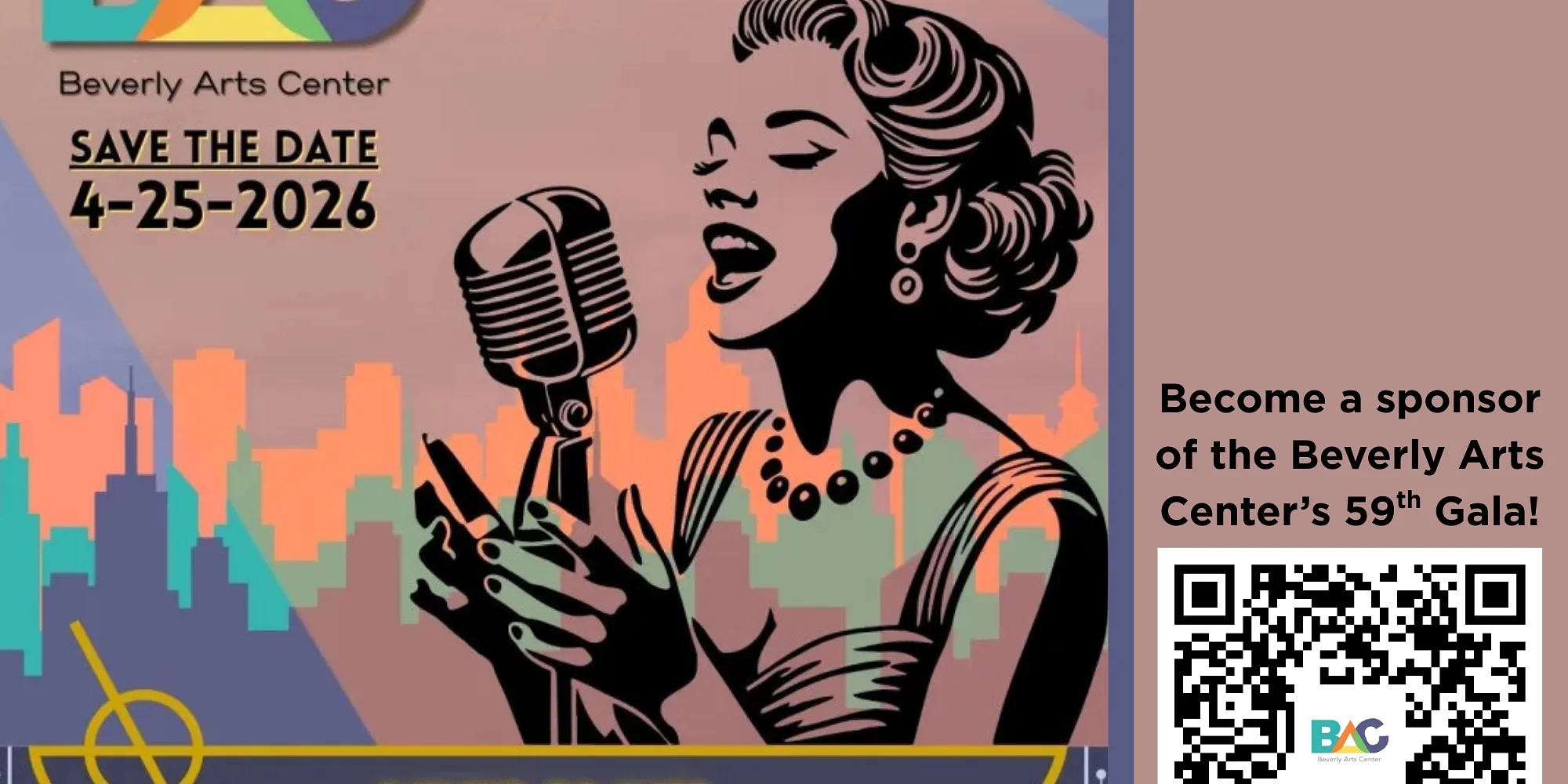 SPONSOR THE GALA HERE! BAC 59th Anniversary Gala: A Night of Glitz, Glamor and All That Jazz April 25th, 2026 7pm-10pm Before March 8th – $100 After March 8th – $150 Patrons Under 30 (Before March 1st) – $75 Golden Age Patrons Over 65 (Before March 1st) – $75 It will be a hot night and some swinging jazz with the coolest cats in town! Join us on April 25 for the Beverly Arts Center 59th Annual Auction: Bev Beats: Southside Streets — A Night of Glitz, Glamor and All That Jazz! Paint the town red with Cocktails, Music & Dancing, Savories and Sweets, and Live & Silent Auctions. Get your tickets now! Tickets are $100 if purchased before March 1st and $150 after March 1st. For Young Arts Patrons under 30 and Golden Age Patrons over 65, a special ticket rate of $75 is available until March 1. Event to take place at the Beverly Arts Center. PURCHASE TICKETS HERE