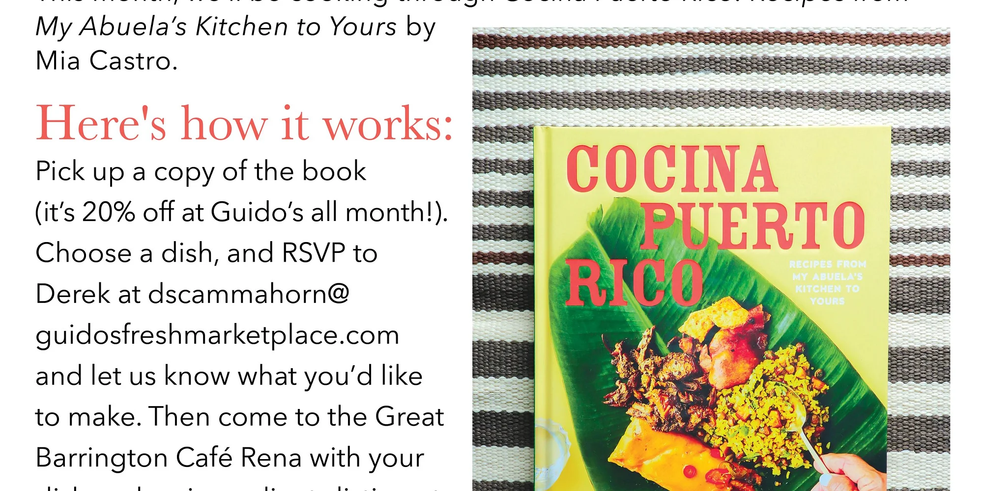You’re invited to our Cookbook Club Potluck! This month, we’ll be cooking from Cocina Puerto Rico by Mia Castro. Mia is a passionate advocate for Puerto Rican cuisine and brings such a personal, heartfelt touch to every recipe in this book. If you have never explored Puerto Rican cooking before, get ready to fall in love. This gorgeous book is a wonderful tribute to the island’s most beloved recipes, think warm and comforting classics, deeply flavorful marinades, and dishes that feel like a big hug from the inside out. The food is soulful, vibrant, and just plain delicious. Needless to say, we are in for such a treat! Here’s how it works: Pick up a copy of the book (it’s 20% off at Guido’s all month!). Choose a dish, and RSVP to Derek at dscammahorn@guidosfreshmarketplace.com and let us know what you’d like to make. Then join the party at the Great Barrington Café Rena with your dish and an ingredients listing at 7 pm on Thursday, March 26th.
