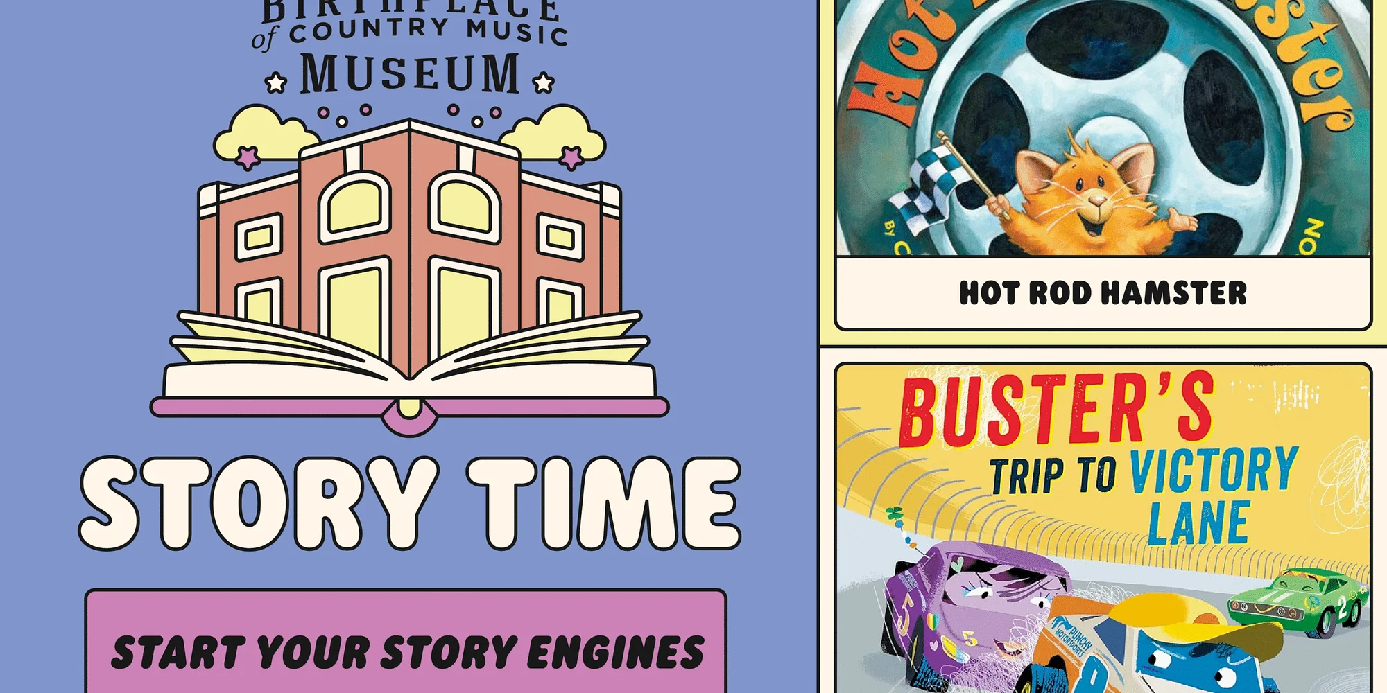 Date: Friday, June 5, 2026 Time: 10:30 a.m. EST Location: The Learning Center, Birthplace of Country Music Museum Cost: Free and open to the public Theme: Start your Story Engines Join us in the museum’s Learning Center for our monthly Museum Storytime program. Aimed at toddler-age children and their grown-ups, we will gather on the first Friday of each month for a music- or Appalachia-related storybooks, a tune or two by WBCM Radio Bristol show host Ella Patrick, and a related activity or coloring sheet. Books that will be featured at Story Time include: Hot Rod Hamster by Cynthia Lord Buster’s Trip to Victory Lane by Dale Earnhardt Jr.