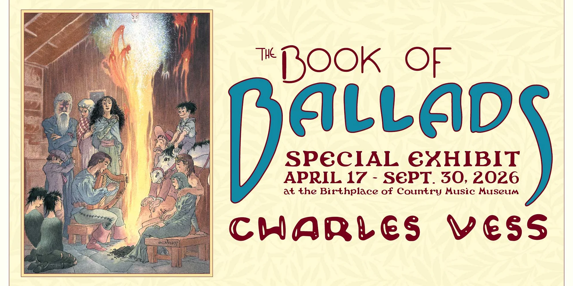 Dates: April 17 – September 30, 2026 Location: Special Exhibits Gallery, Birthplace of Country Music Museum Ballads – folk songs that tell a story through narrative verse – have been passed down through English, Irish, and Scottish oral traditions and continue to echo throughout the Appalachian Mountains today. Ballads have long captured the hearts and imagination of songsters, storytellers, and listeners, including award-winning illustrator Charles Vess. In 1993 Vess was inspired to illustrate the ballads he had loved to listen to for so many years. He worked with several award-winning and ballad-loving fantasy authors to develop scripts and compiled a series of beautifully illustrated comics, which he published in The Book of Ballads. The exhibit, Charles Vess: The Book of Ballads, features seven ballads reimagined by some of the greatest fantasy writers of our time. The featured comics, including “The False Knight on the Road” by Neil Gaiman, “Thomas the Rhymer” by Sharyn McCrumb, and “Barbara Allen” by Midori Snyder, are an excellent introduction to traditional ballads for those not yet familiar and a special treat for those who already are. The exhibit also explores the tradition of ballad singing in Appalachia and traces the origin of each ballad and its journey through time. After all, singing is one way to keep ballads alive, art is another. About Charles Vess Charles Vess is a well-known illustrator of mythic fiction. Born in Virginia, he began his career working on Marvel’s “Spider-Man” followed by work for other graphic novels and illustrated books at publishing houses such as Tor, Harper, Abrams, and Subterranean Press while living in New York City. Some favorite collaborations include Ursula K. LeGuin’s The Books of Earthsea: The Complete Illustrated Edition (Saga) and Rose (Scholastic) with Jeff Smith, as well as Susanna Clarke’s Jonathan Strange & Mr Norrell (Folio Society) Joanne M. Harris (Honeycomb) and Charles de Lint (The Cats of Tanglewood Forest, Seven Wild Sisters). Over the years he has also worked extensively with British writer Neil Gaiman (Sandman), including their novel Stardust, which was made into a major film. In 2022 his first novel, The Queen of Summer’s Twilight (NewCon Press) was published. Set in Scotland as well as across the border into Faerie it is based on the ancient ballad of Tam-Lin. Another favorite is Walking Through the Landscape of Faerie (Faerie Magazine) a book of art, story and poetry designed by Vess with contributions from many of his favorite writers. This book is only available through its publisher’s website and from Charles Vess himself. Please drop by his table and pick up a copy. Vess’ artwork has also been exhibited in museums and galleries around the world. He has won two Hugo, four World Fantasy, three Chesley, six Locus, one Mythopoeic, and two Will Eisner awards for Best Artist over the years. He lives on the North Fork River in southwestern Virginia where he works diligent...